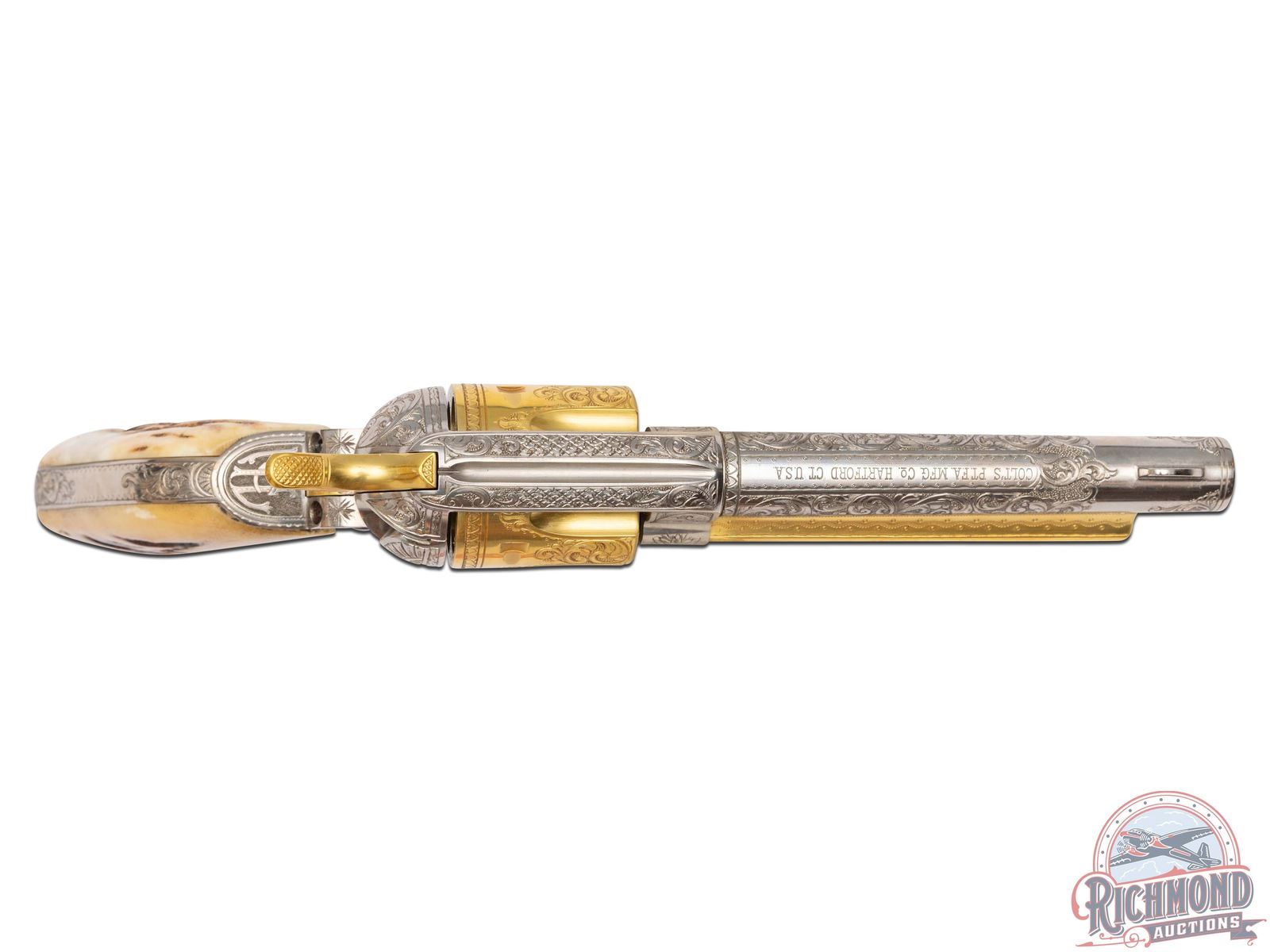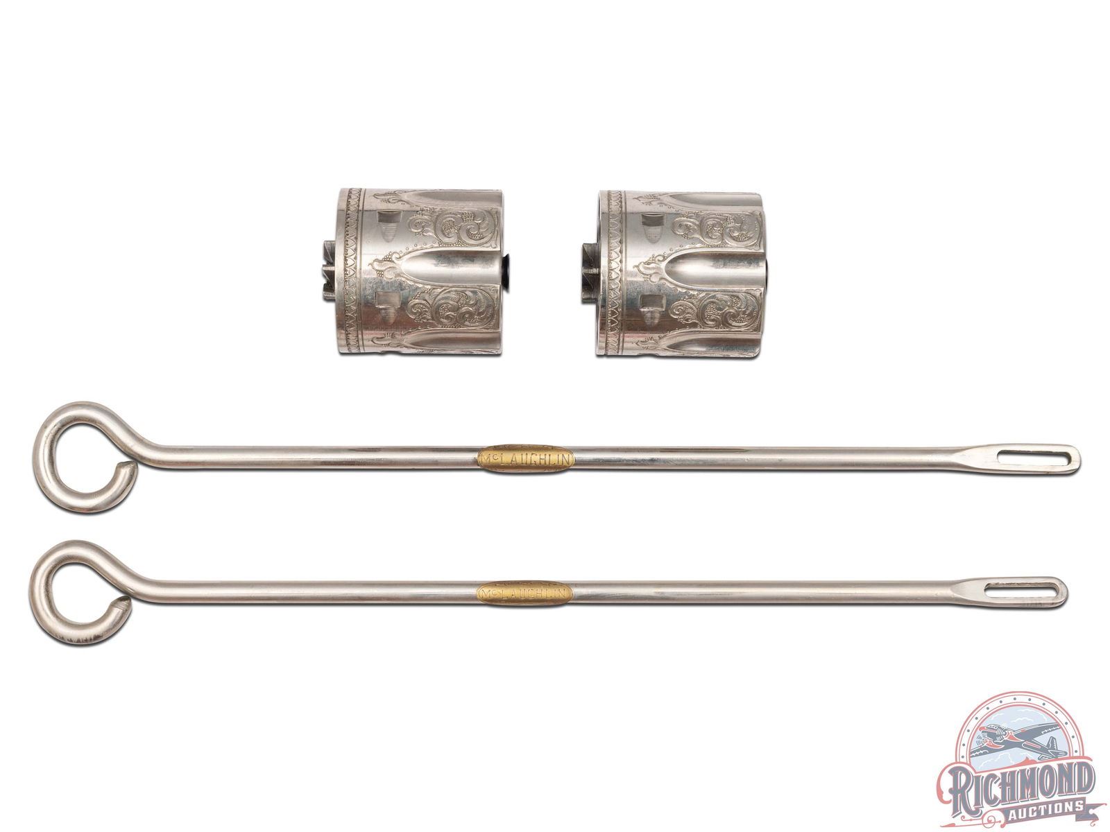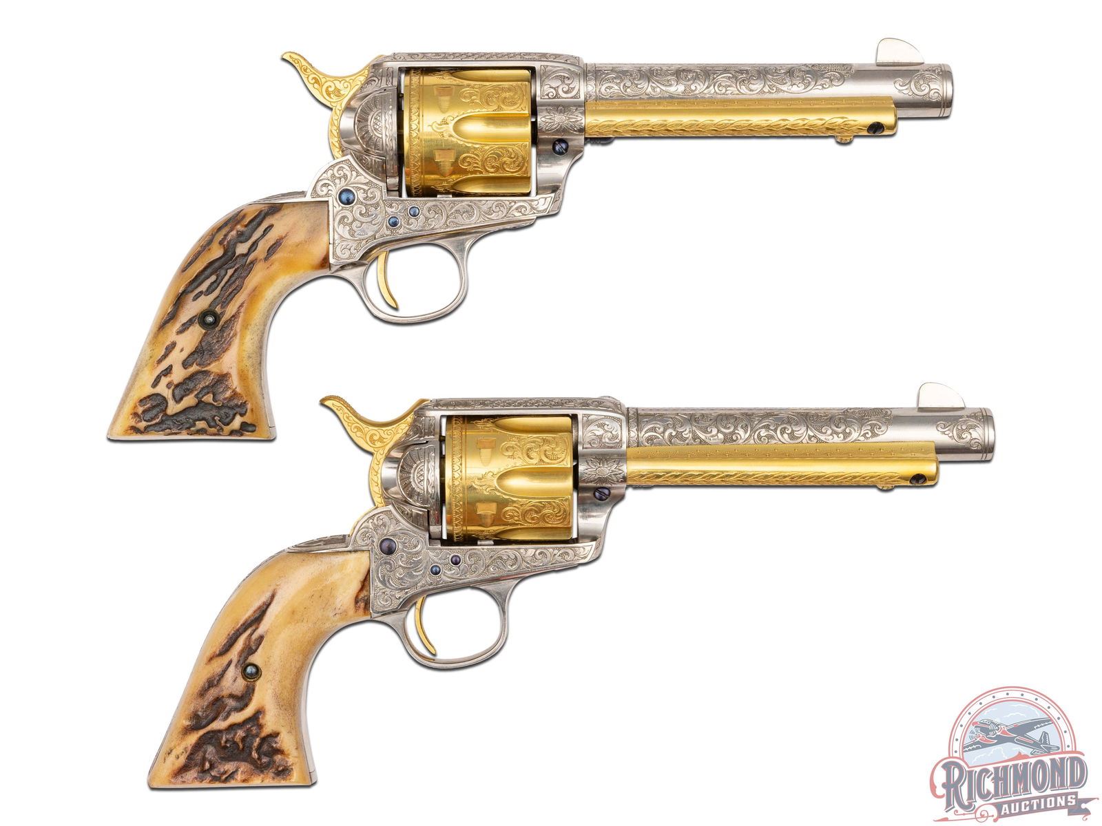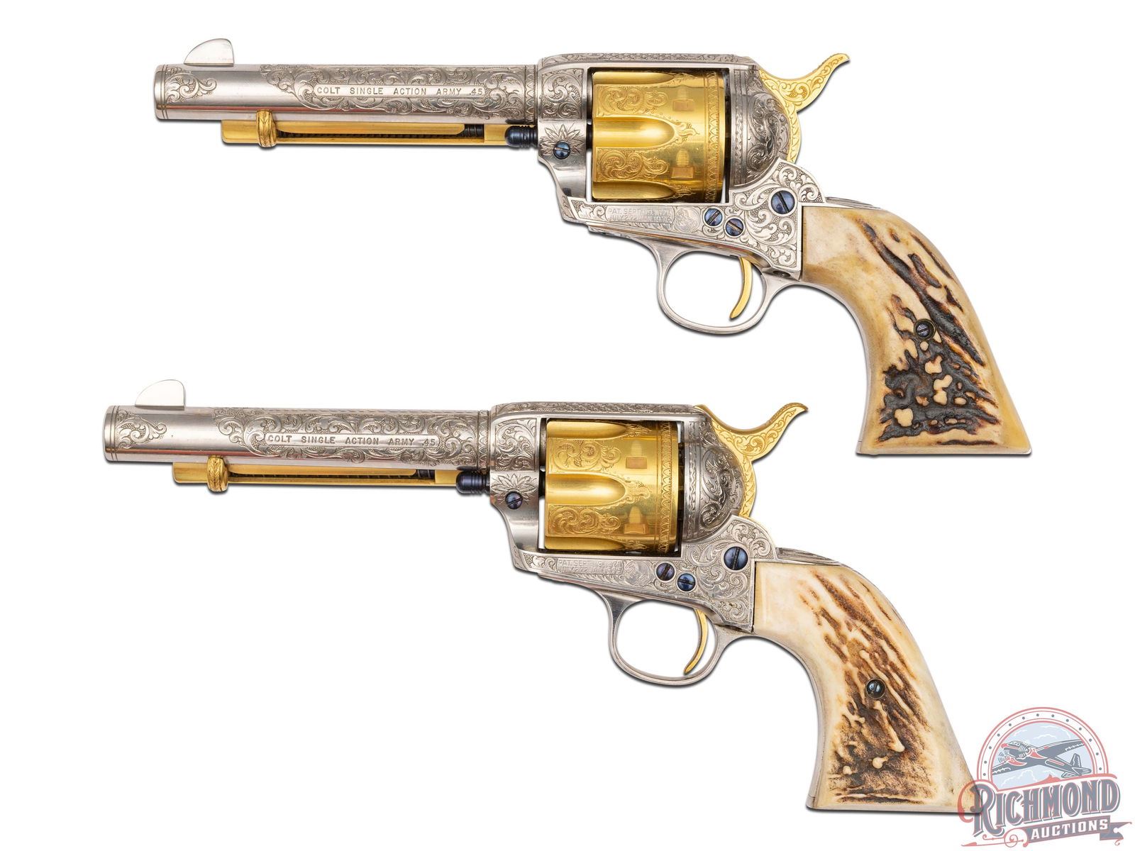 Manufactured in 1901 and 1903. These identical custom revolvers feature 5-1/2" barrels with notch and blade front sights. Single line Colt address on top of the barrel and "COLT SINGLE ACTION ARMY 45" stamped on the left side. Left side of the frames have a 2-line, 3 patent date and rampant Colt logo. Nickel and gold-plated finish. They are fitted with Sambar stag grips. Each revolver is accompanied by a spare nickeled cylinder in 45 ACP caliber. Revolvers are engraved identically by Horatio Acevedo and signed on bottom front edge of the frames. Engraving covers around 80% of each firearm and consist of floral scroll, arabesque patterns with punch dot background. Engraving extends over both sides of the barrel stopping just behind front sight with small patterns on each side of the muzzle. Loading gates are engraved with Helfricht-style sunbursts with flower blossoms on each side of front of frame. Ejector rod housings are engraved with a climbing leaf pattern on outer radius with snake & dot pattern in top gullets. Top rail is engraved with a fleur-de-lis and dot like pattern. Sides of hammers are engraved with a floral scroll pattern. Top of backstraps are nicely engraved with the initials "McL." Backstraps have matching floral scroll engraving near the top, at the heel, and on grip base with matching patterns on trigger bows. All cylinders are identically engraved with the floral scroll pattern between the flutes and a scalloped border at rear edges. Screws & base pins are all fire-blued. This set comes in a fine custom oak case with brass corner reinforcements and a scalloped edge brass plaque engraved "McLaughlin / Lake Forest." Interior is green velvet lined with bottom compartmented for two revolvers with two empty covered compartments and a compartment for the two spare cylinders. Includes two nickeled steel cleaning rods, each with a small brass plaque engraved "MCLAUGHLIN". Each end of the case has a cartridge block for 12 cartridges. *Please Note Ammunition shown is for Display ONLY and WILL NOT be shipped with the firearms. Per consignor; this pair belonged to Major Frederick McLaughlin, first owner of the Chicago Blackhawks NHL team from 1926-1942. A brief history on Major McLaughlin is included. His son William McLaughlin had these SAA's gold-plated and engraved during the 1970's. CALIBER: 45 ACP / COLT. S/N: 240397 / 219055. FFL STATUS: Curio & Relic.