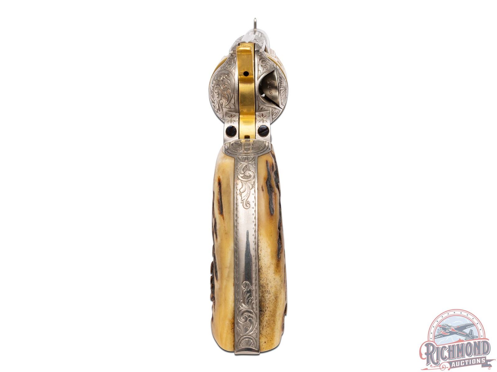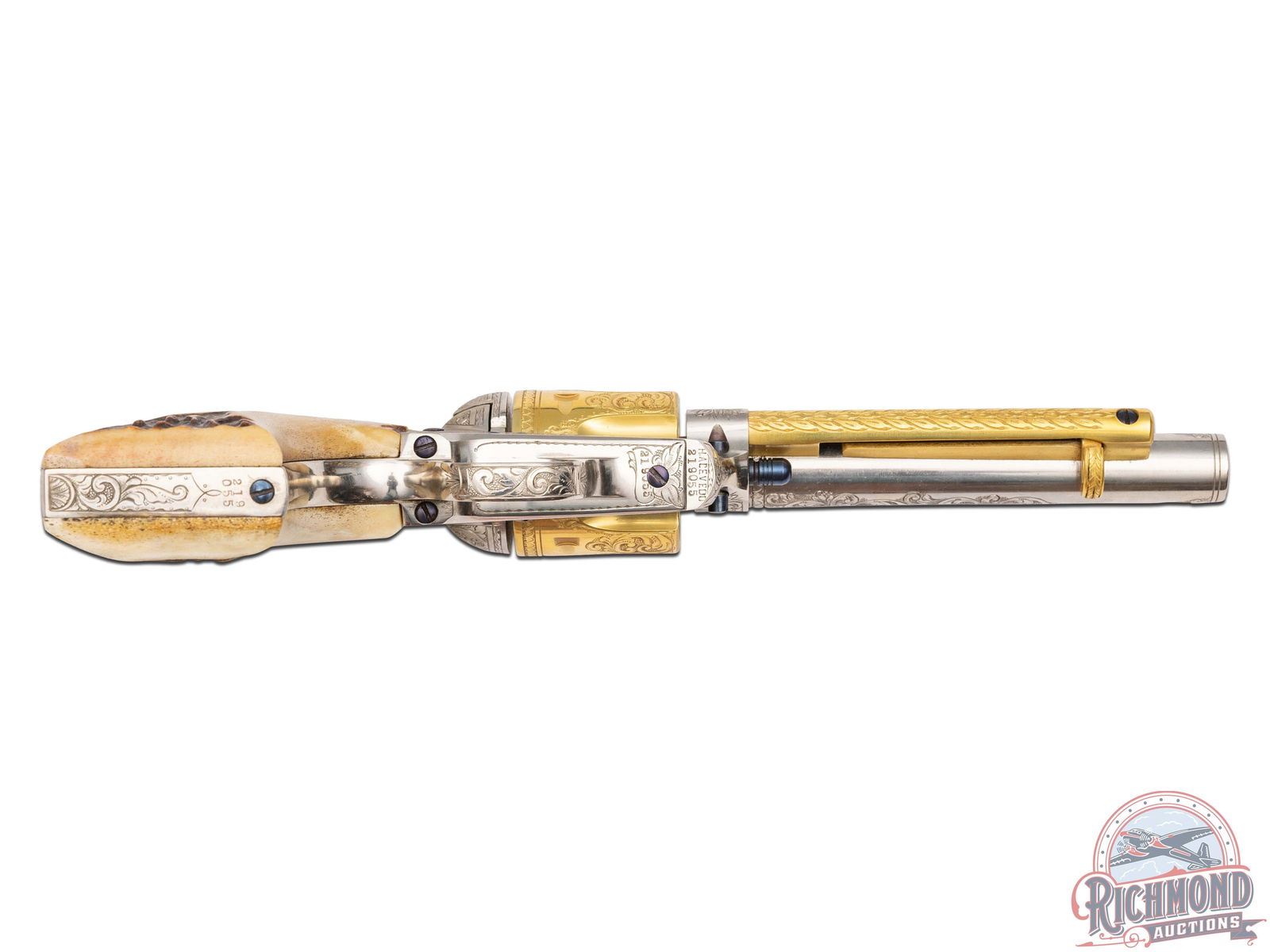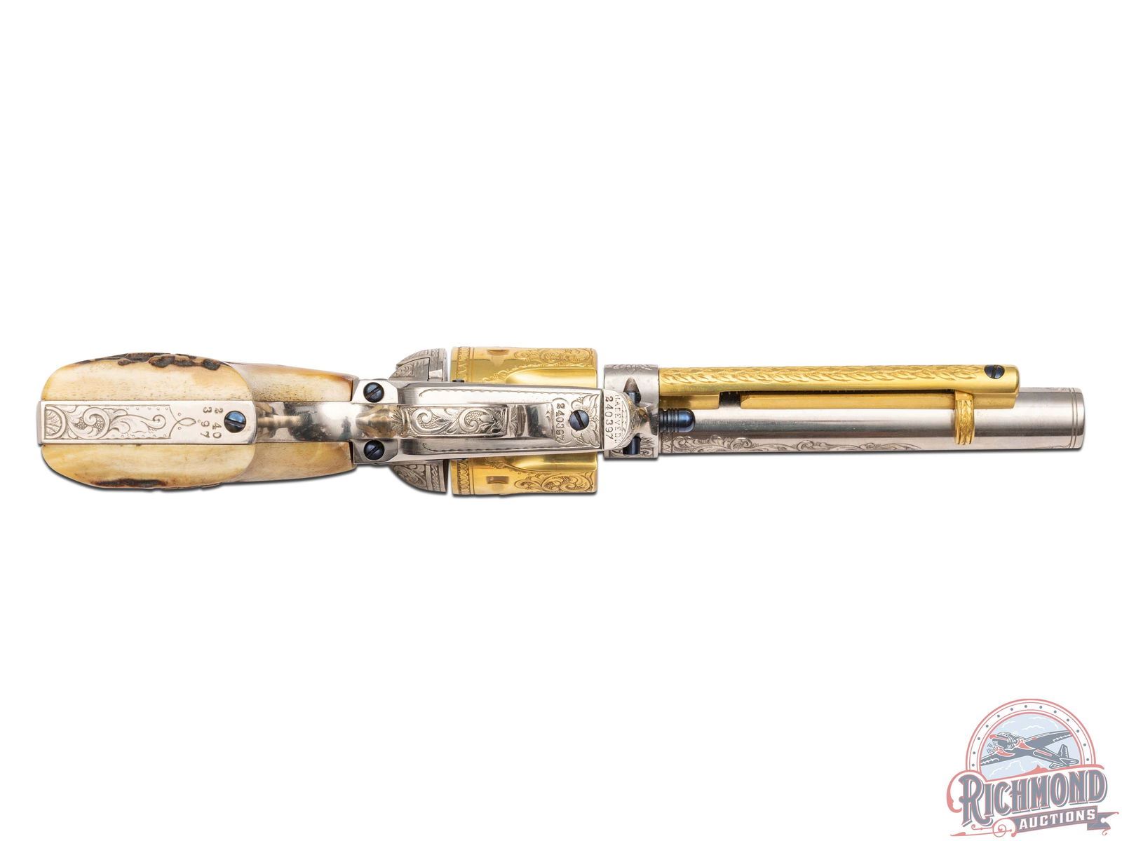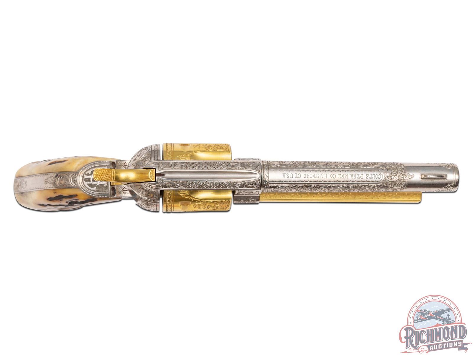 Manufactured in 1901 and 1903. These identical custom revolvers feature 5-1/2" barrels with notch and blade front sights. Single line Colt address on top of the barrel and "COLT SINGLE ACTION ARMY 45" stamped on the left side. Left side of the frames have a 2-line, 3 patent date and rampant Colt logo. Nickel and gold-plated finish. They are fitted with Sambar stag grips. Each revolver is accompanied by a spare nickeled cylinder in 45 ACP caliber. Revolvers are engraved identically by Horatio Acevedo and signed on bottom front edge of the frames. Engraving covers around 80% of each firearm and consist of floral scroll, arabesque patterns with punch dot background. Engraving extends over both sides of the barrel stopping just behind front sight with small patterns on each side of the muzzle. Loading gates are engraved with Helfricht-style sunbursts with flower blossoms on each side of front of frame. Ejector rod housings are engraved with a climbing leaf pattern on outer radius with snake & dot pattern in top gullets. Top rail is engraved with a fleur-de-lis and dot like pattern. Sides of hammers are engraved with a floral scroll pattern. Top of backstraps are nicely engraved with the initials "McL." Backstraps have matching floral scroll engraving near the top, at the heel, and on grip base with matching patterns on trigger bows. All cylinders are identically engraved with the floral scroll pattern between the flutes and a scalloped border at rear edges. Screws & base pins are all fire-blued. This set comes in a fine custom oak case with brass corner reinforcements and a scalloped edge brass plaque engraved "McLaughlin / Lake Forest." Interior is green velvet lined with bottom compartmented for two revolvers with two empty covered compartments and a compartment for the two spare cylinders. Includes two nickeled steel cleaning rods, each with a small brass plaque engraved "MCLAUGHLIN". Each end of the case has a cartridge block for 12 cartridges. *Please Note Ammunition shown is for Display ONLY and WILL NOT be shipped with the firearms. Per consignor; this pair belonged to Major Frederick McLaughlin, first owner of the Chicago Blackhawks NHL team from 1926-1942. A brief history on Major McLaughlin is included. His son William McLaughlin had these SAA's gold-plated and engraved during the 1970's. CALIBER: 45 ACP / COLT. S/N: 240397 / 219055. FFL STATUS: Curio & Relic.