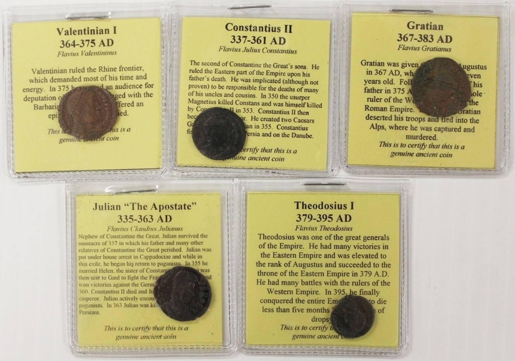 CONSTANTIUS II 337-361 AD, GRATIAN 367-383 AD, JULIAN "THE APOSTATE" 335-363 AD, THEODOSIUS I 379-395 AD, VALENTINIAN I 364-375 AD. ESTIMATE: $500-$600