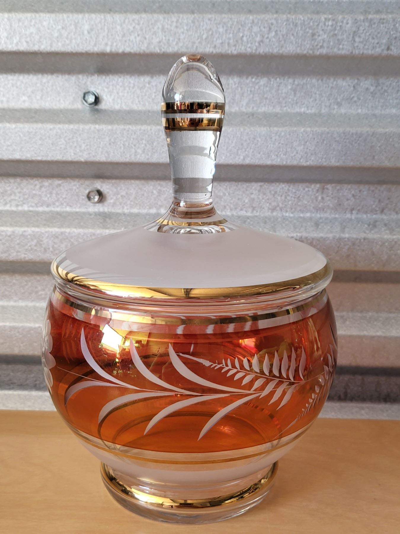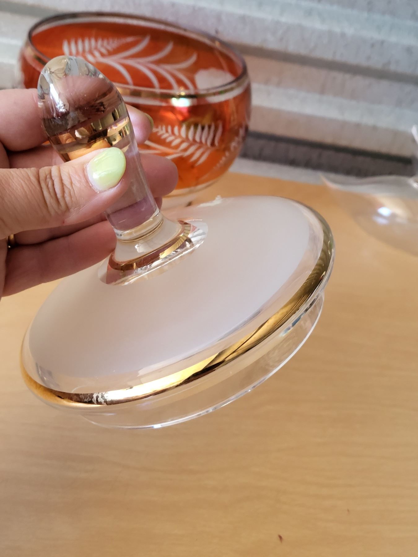 NICE SIZED VINTAGE ORANGE ETCHED GLASS LIDDED CANDY DISH