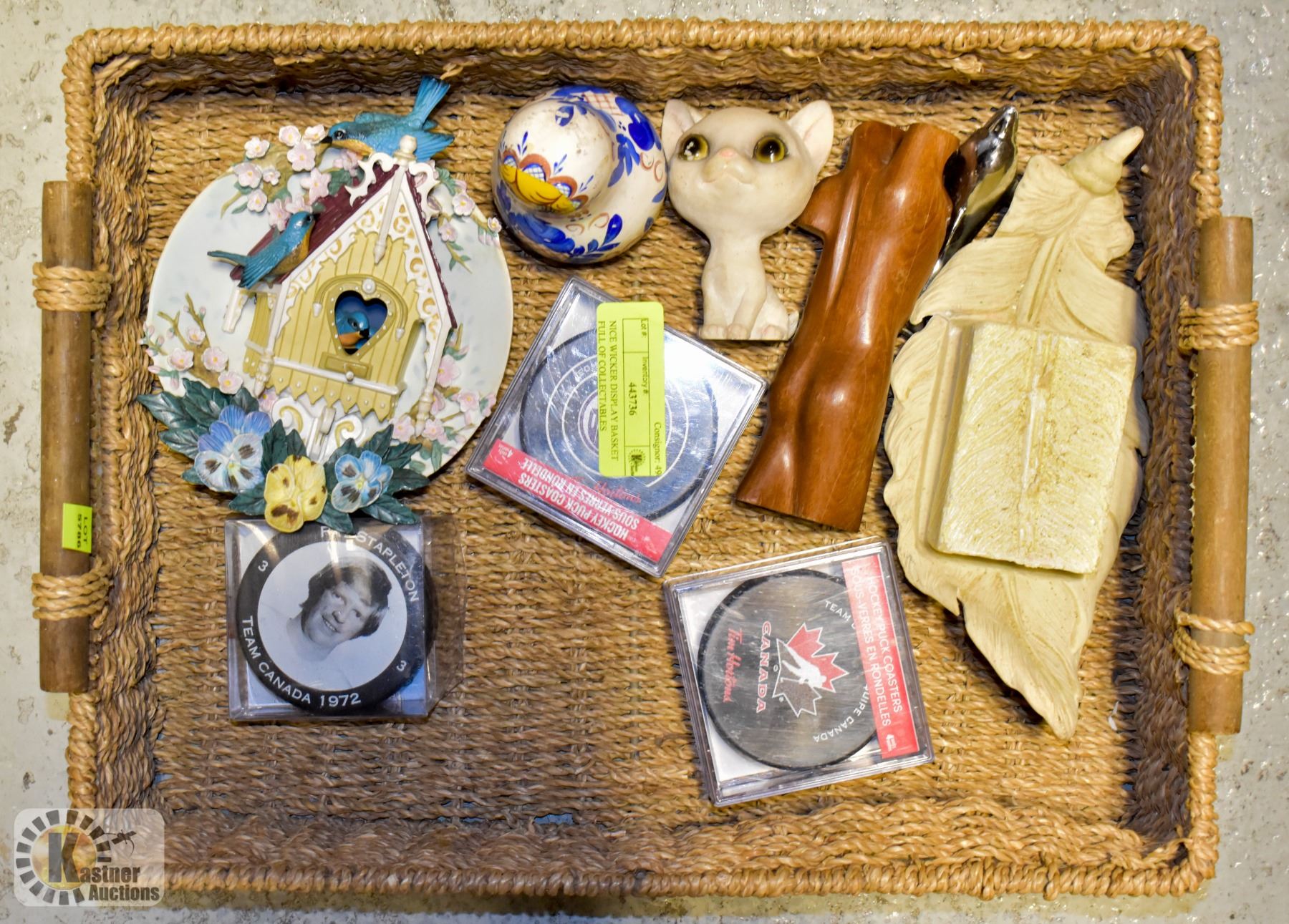 NICE WICKER DISPLAY BASKET FULL OF COLLECTABLES