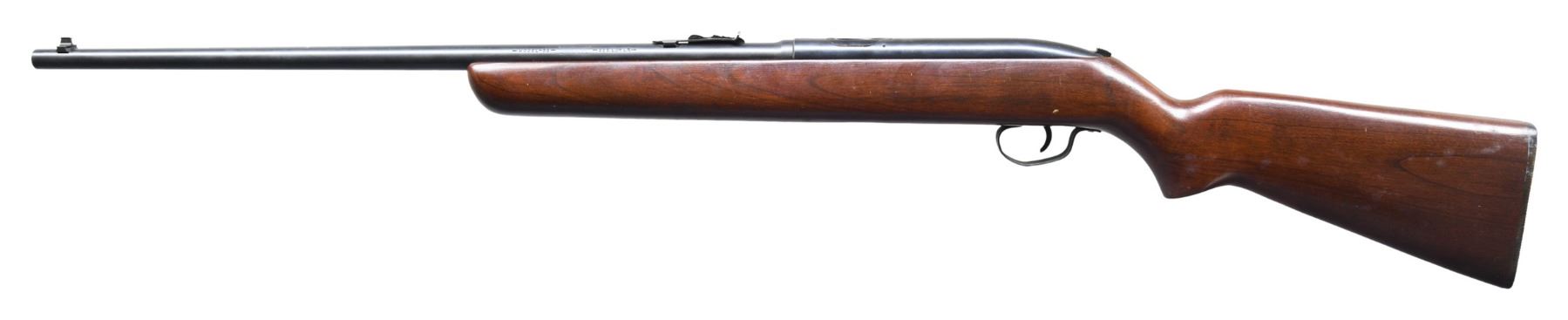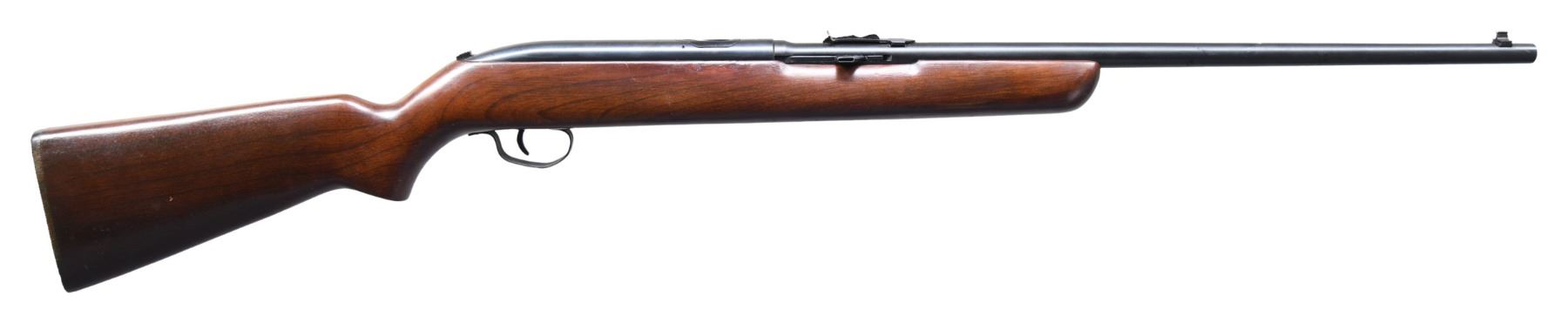 RIFLE. Cal. 22 S, L, LR. NSN. Bbl. 21 3/4". Model 55 auto ejecting single shot rifle mfg. by Winchester between 1957-61. The left side of the bbl. is marked with the model designation, followed by the Winchester trademark logo, as well as the cal. designation. Metal components exhibit a blue finish overall. Plain wood pistol grip buttstock, with Winchester checkered black synthetic buttplate. Dovetailed aluminum beaded blade front sight, with dovetailed U-notch rear sight. CONDITION: metal components retain bountiful amounts of their original factory blue finish, exhibiting a few superficial handling marks, as well as a few scattered spots of light to mild surface oxidation overall. Mirror bore, exhibiting well defined rifling throughout. Stock shows some superficial marks and minor impressions from handling and storage, but otherwise remains sturdy and serviceable. PROVENANCE: Estate of Russell Dickerman. (25-1771/MLW). CURIO. $300-400.
