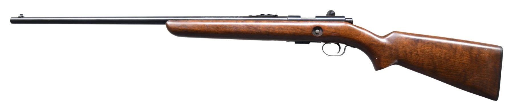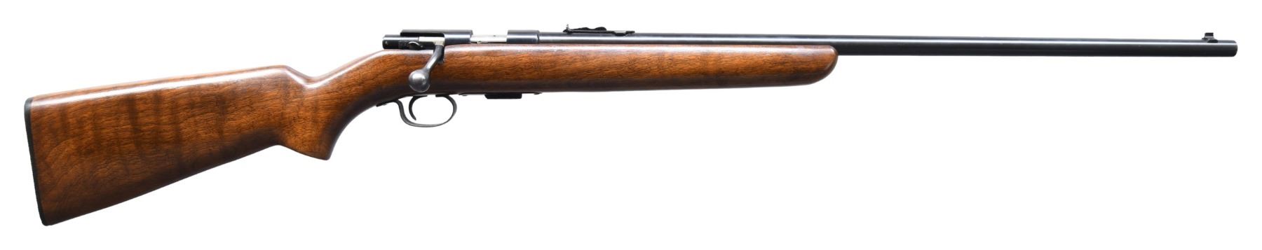 Cal. 22 S, L, LR. NSN. Bbl. 25 1/8". Model 69A bolt action rifle mfg. by Winchester between 1935-1963. The left side of the bbl. is marked with Winchester's mfg. information, followed by the Winchester trademark logo, as well as the model and cal. designations. Metal components exhibit a blue finish overall, save for on the bolt body, which is polished in-the-white. 1-piece plain wood pistol grip buttstock. Dovetailed aluminum beaded blade front sight, with dovetailed U-notch rear sight. CONDITION: metal components retain bountiful amounts of their original factory blue finish, exhibiting a few spots of light edge wear, with a few small light spots of surface oxidation and pitting present on the underside of the bbl. Bolt knob exhibits areas of wear and thinning that show through to gray patina. Mirror bore, exhibiting well defined rifling throughout. Stock shows a few scattered superficial marks and minor impressions from handling and storage, but otherwise remains very good overall. PROVENANCE: Estate of Russell Dickerman. (25-1781/MLW). CURIO. $300-400.