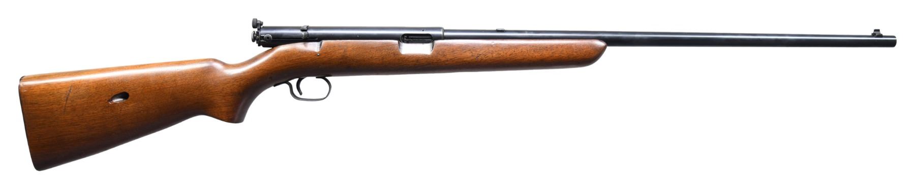 Cal. 22 LR. S# 157474. Bbl. 22". Model 74 semi-automatic rifle mfg. by Winchester in 1947. The left side of the bbl. is marked with Winchester's mfg. information, followed by the Winchester trademark logo, as well as the model and cal. designations. Left side of the receiver is marked with the S#. Metal components exhibit a blue finish overall. Plain wood pistol grip buttstock, with flat checkered steel buttplate. Aluminum beaded blade front sight, with receiver mounted aperture rear sight. Bbl. rear sight slot is fitted with slot blank. CONDITION: metal components retain bountiful amounts of their original factory blue finish, exhibiting a few spots of light edge wear, with some superficial handling marks present overall. Mirror bore, exhibiting well defined rifling throughout. Stock shows some superficial marks and minor impressions from handling and storage, but otherwise remains sturdy and serviceable. PROVENANCE: Estate of Russell Dickerman. (25-1778/MLW). CURIO. $300-400.