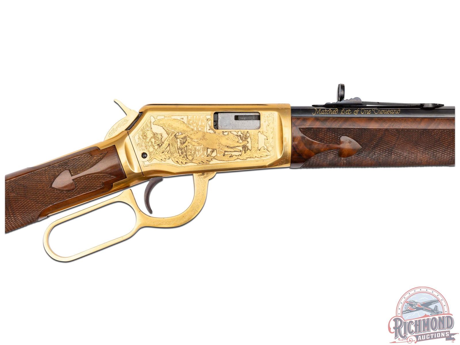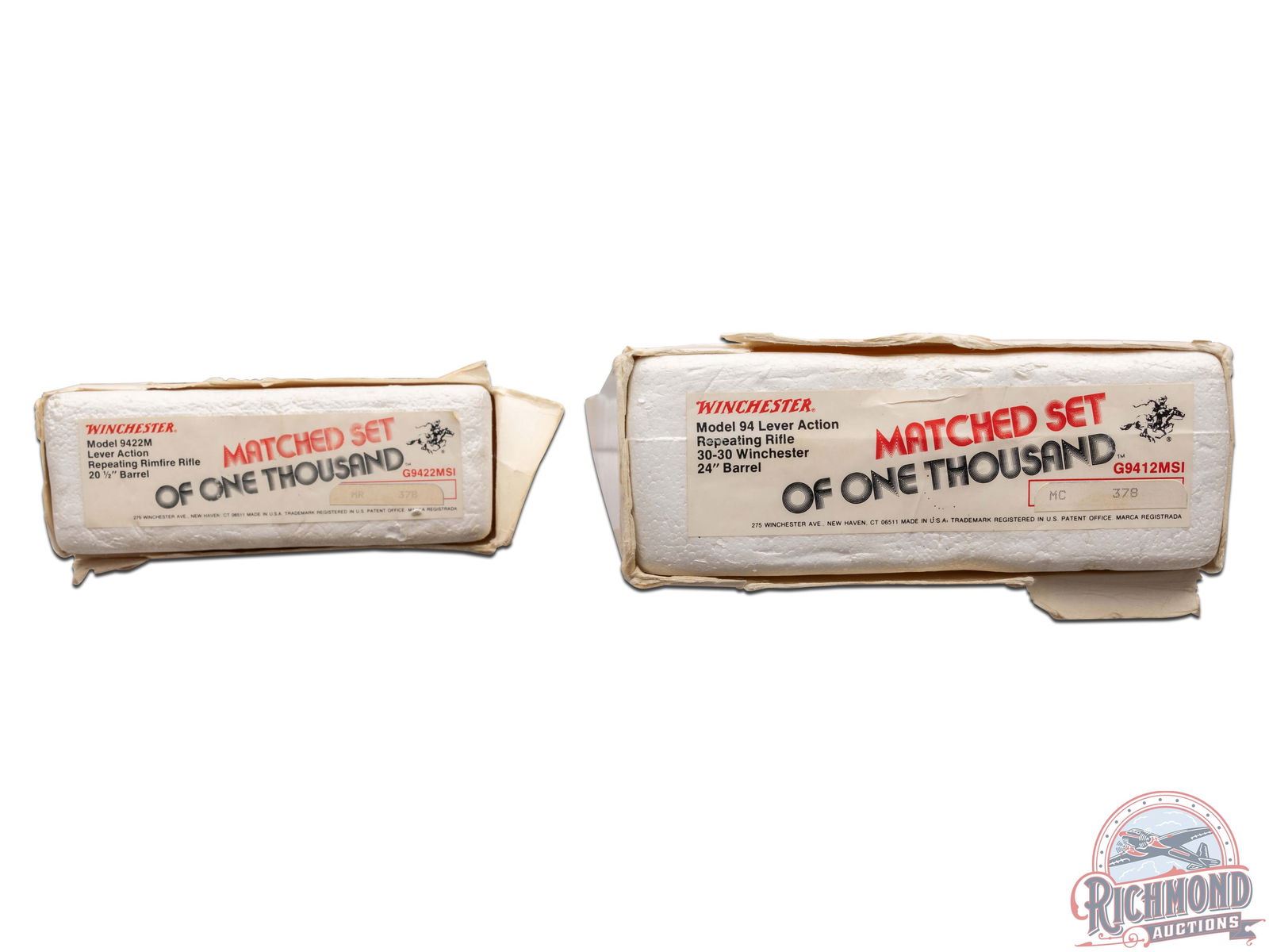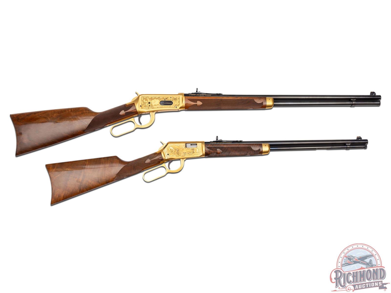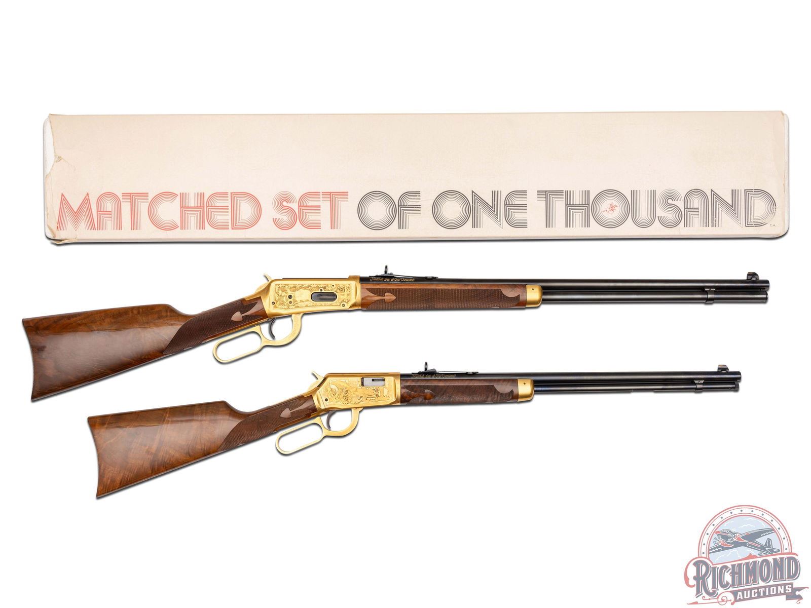 Manufactured in 1979, this matched set was the first two rifle commemorative set ever offered by Winchester . (1) Model 9422M chambered in .22 WIN Magnum, features a 20-1/2" blued round barrel with full length tubular magazine. Left side of the action features two beagles chasing a rabbit surrounded by an oak leaf design. Right side features two squirrels in a wooded scene surrounded by an oak leaf design. (2) Model 1894 chambered for .30-30 WIN, features a 24" blued barrel with full length tubular magazines. Left side of the action features two Whitetail bucks in rut and right side features a grizzly after dinner in a stream. Both scenes are surrounded by an oak leaf design. Both rifles are engraved on the right side of the barrel in gold lettering "MATCHED SET OF ONE THOUSAND". Both are equipped with nicely figured walnut straight stock with fleur-de-lis checkering, matching forearm with gold washed tip, and each fitted with a blued steel butt plate. Both come in the original factory Styrofoam cases with sleeves and factory shipping boxes. Includes a beautiful wood display case fitted for both rifles. CALIBER: 22 / 30-30 WIN. S/N: MR378 / MC378. FFL STATUS: Modern.