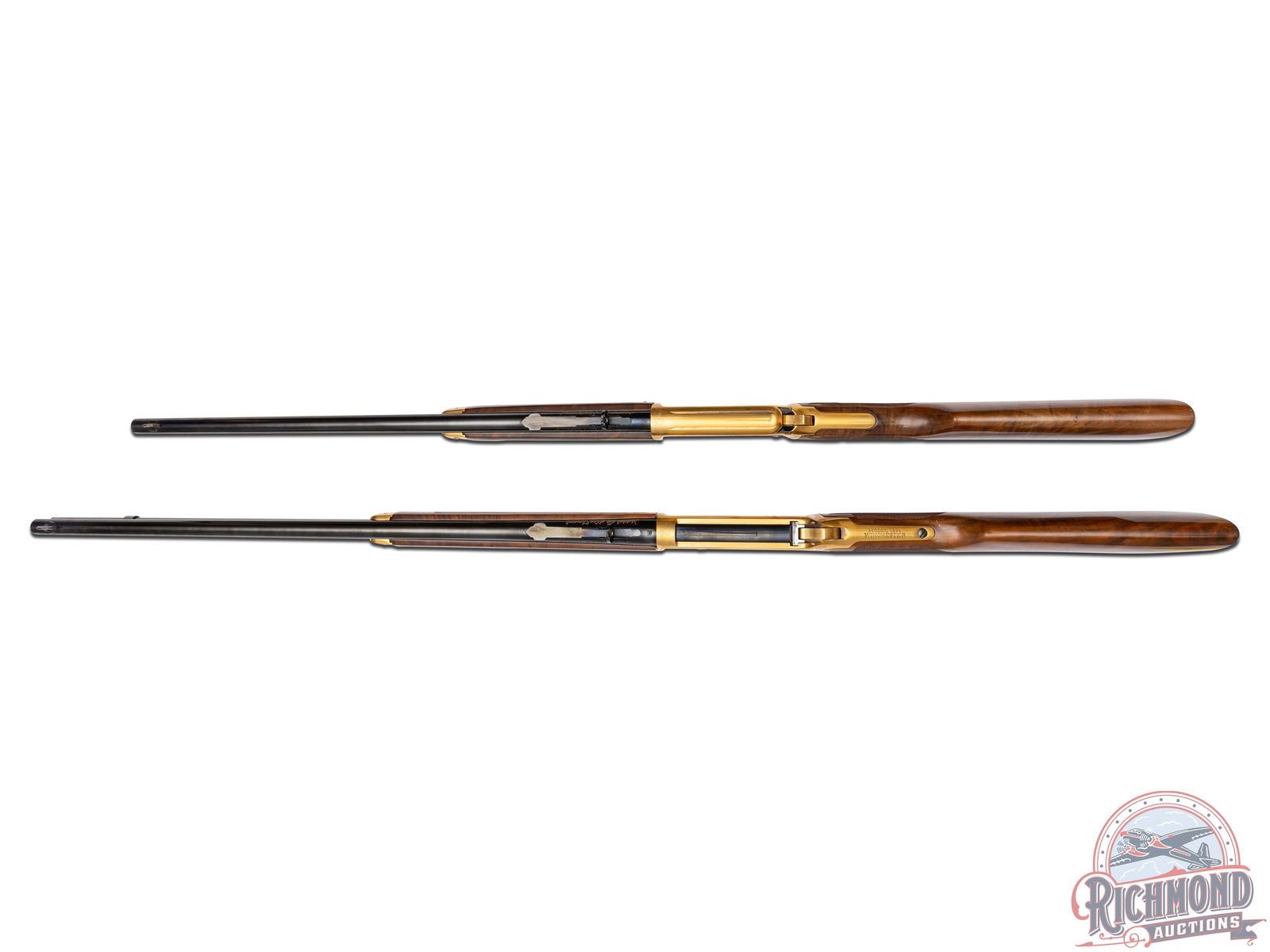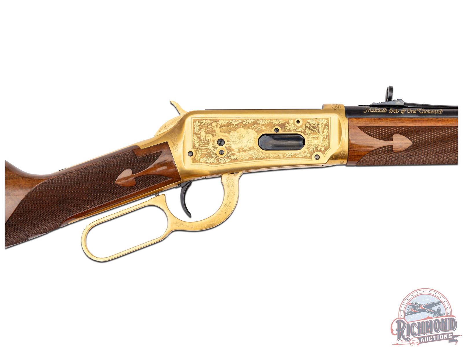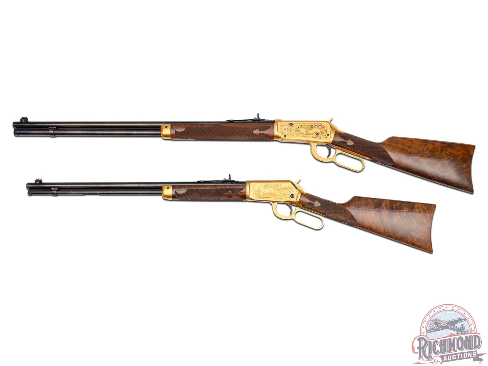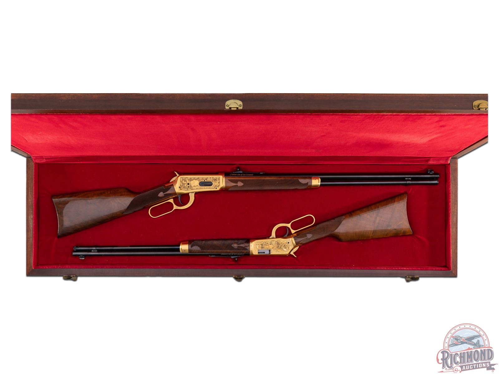 Manufactured in 1979, this matched set was the first two rifle commemorative set ever offered by Winchester . (1) Model 9422M chambered in .22 WIN Magnum, features a 20-1/2" blued round barrel with full length tubular magazine. Left side of the action features two beagles chasing a rabbit surrounded by an oak leaf design. Right side features two squirrels in a wooded scene surrounded by an oak leaf design. (2) Model 1894 chambered for .30-30 WIN, features a 24" blued barrel with full length tubular magazines. Left side of the action features two Whitetail bucks in rut and right side features a grizzly after dinner in a stream. Both scenes are surrounded by an oak leaf design. Both rifles are engraved on the right side of the barrel in gold lettering "MATCHED SET OF ONE THOUSAND". Both are equipped with nicely figured walnut straight stock with fleur-de-lis checkering, matching forearm with gold washed tip, and each fitted with a blued steel butt plate. Both come in the original factory Styrofoam cases with sleeves and factory shipping boxes. Includes a beautiful wood display case fitted for both rifles. CALIBER: 22 / 30-30 WIN. S/N: MR378 / MC378. FFL STATUS: Modern.