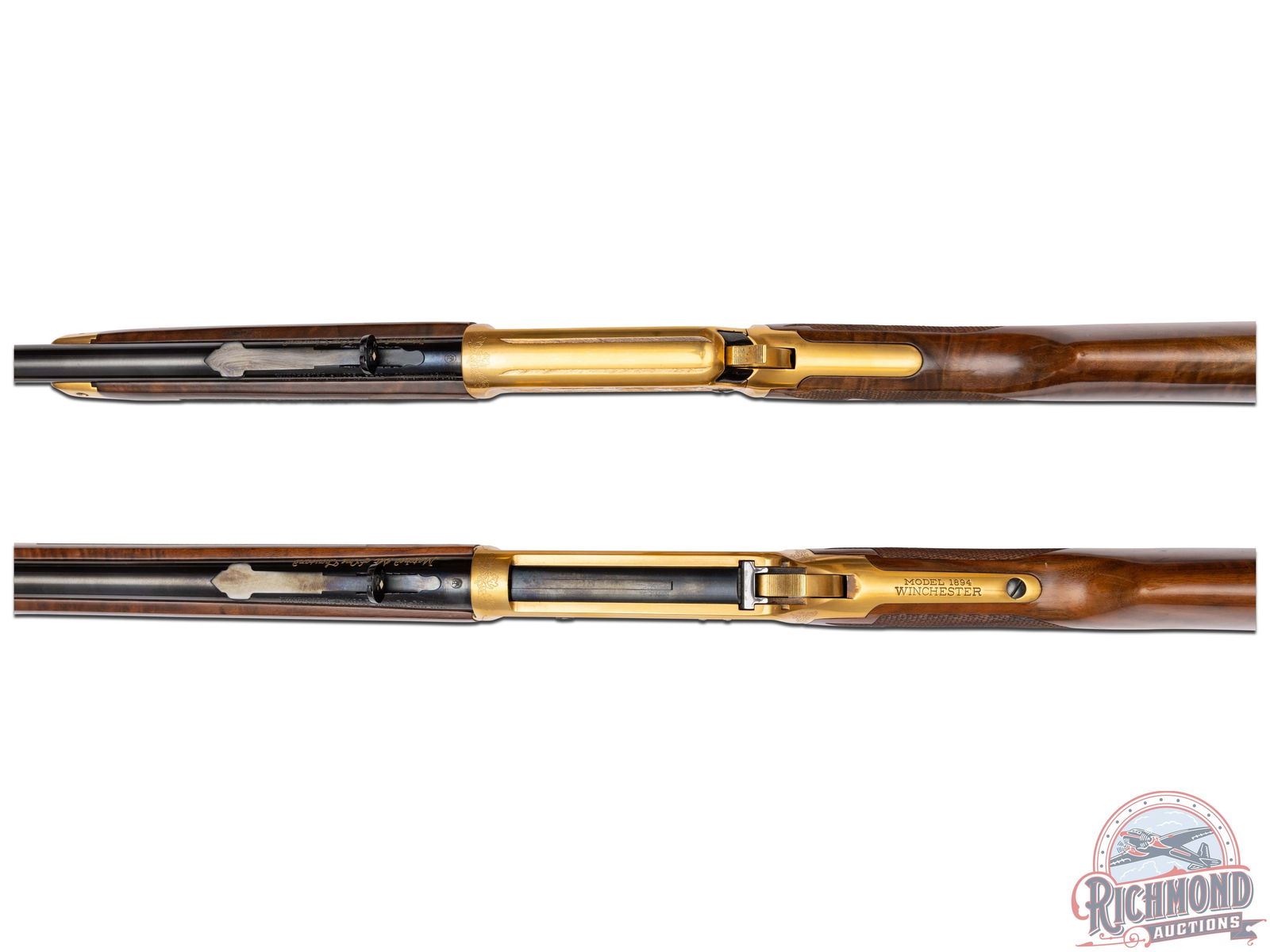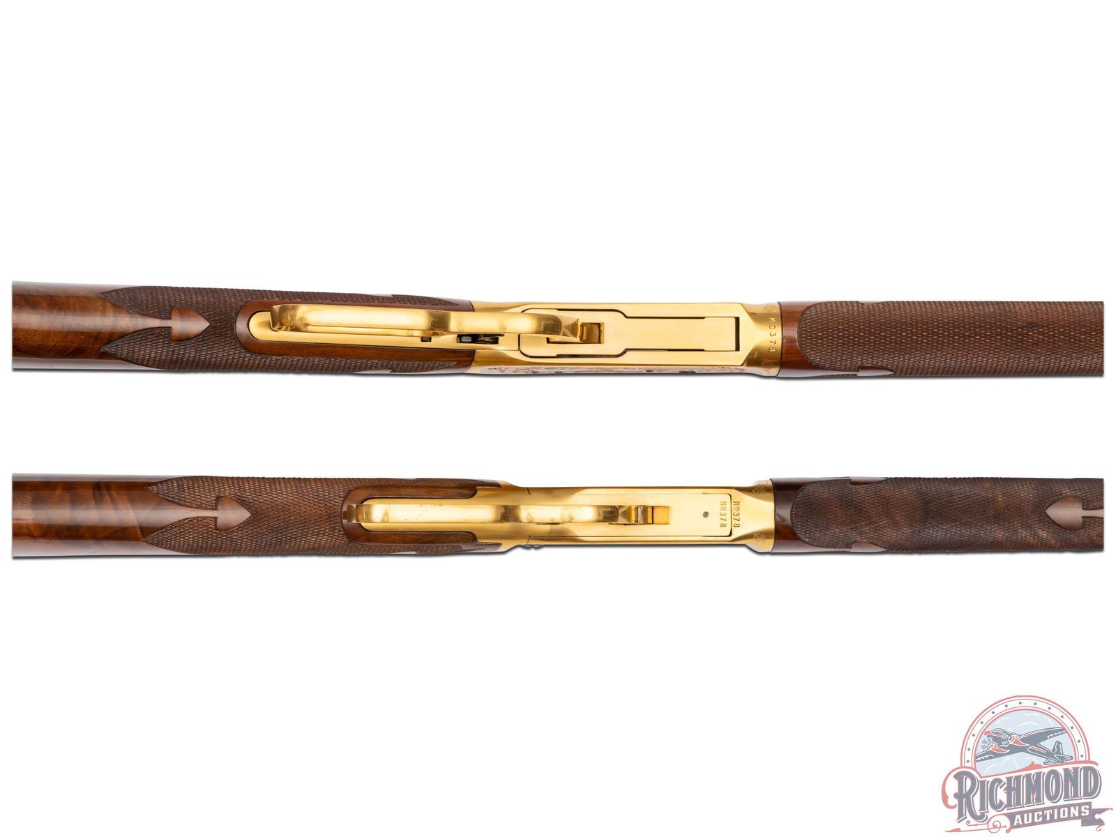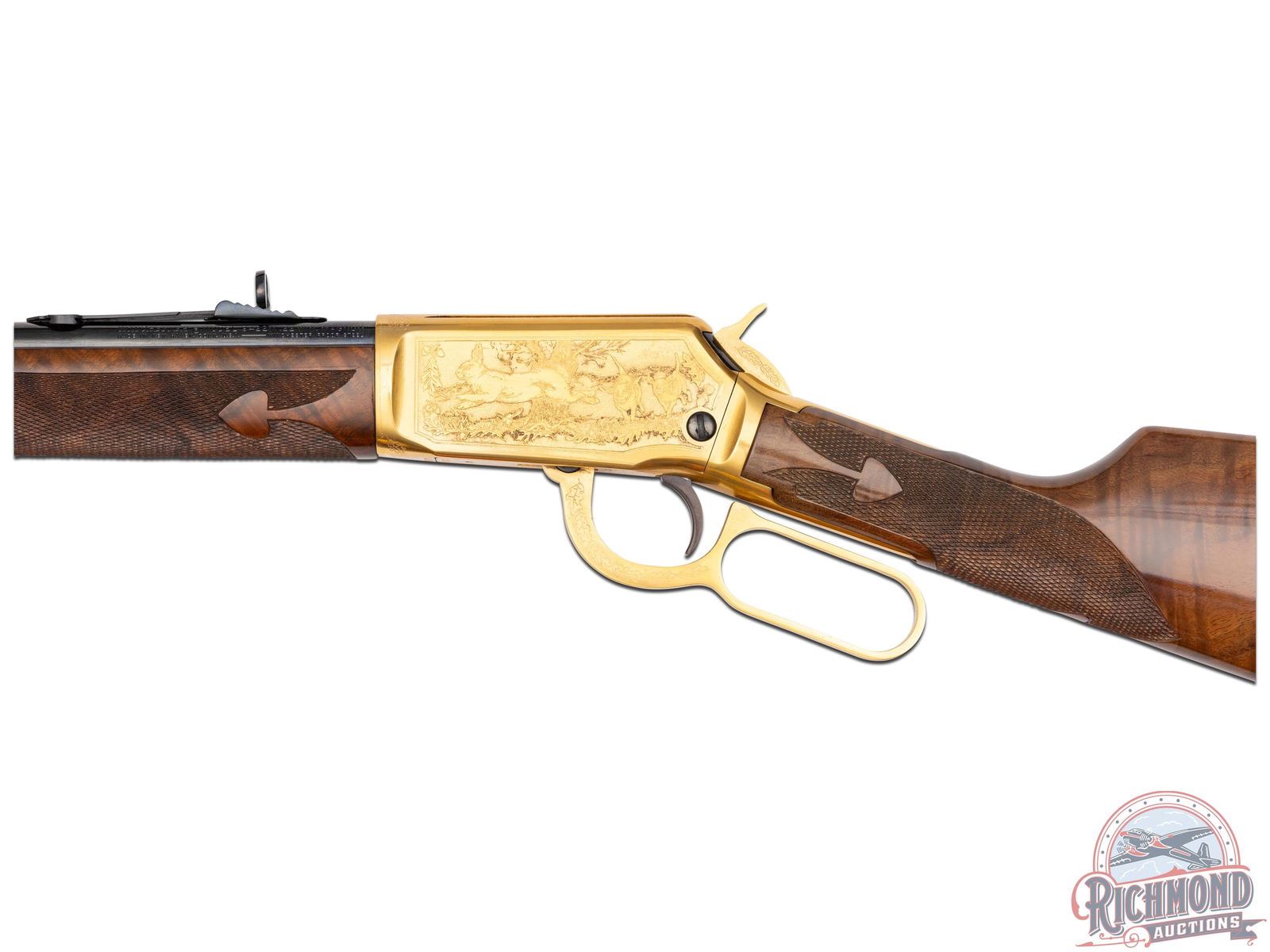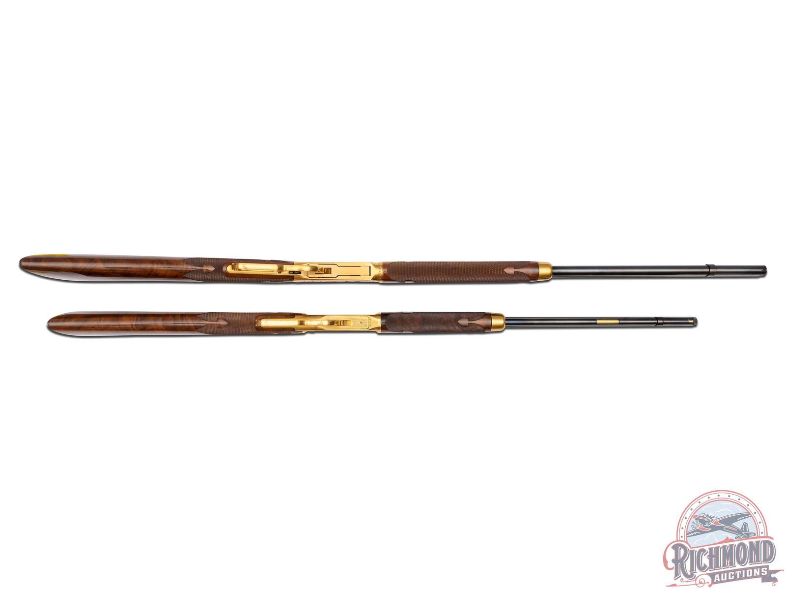 Manufactured in 1979, this matched set was the first two rifle commemorative set ever offered by Winchester . (1) Model 9422M chambered in .22 WIN Magnum, features a 20-1/2" blued round barrel with full length tubular magazine. Left side of the action features two beagles chasing a rabbit surrounded by an oak leaf design. Right side features two squirrels in a wooded scene surrounded by an oak leaf design. (2) Model 1894 chambered for .30-30 WIN, features a 24" blued barrel with full length tubular magazines. Left side of the action features two Whitetail bucks in rut and right side features a grizzly after dinner in a stream. Both scenes are surrounded by an oak leaf design. Both rifles are engraved on the right side of the barrel in gold lettering "MATCHED SET OF ONE THOUSAND". Both are equipped with nicely figured walnut straight stock with fleur-de-lis checkering, matching forearm with gold washed tip, and each fitted with a blued steel butt plate. Both come in the original factory Styrofoam cases with sleeves and factory shipping boxes. Includes a beautiful wood display case fitted for both rifles. CALIBER: 22 / 30-30 WIN. S/N: MR378 / MC378. FFL STATUS: Modern.
