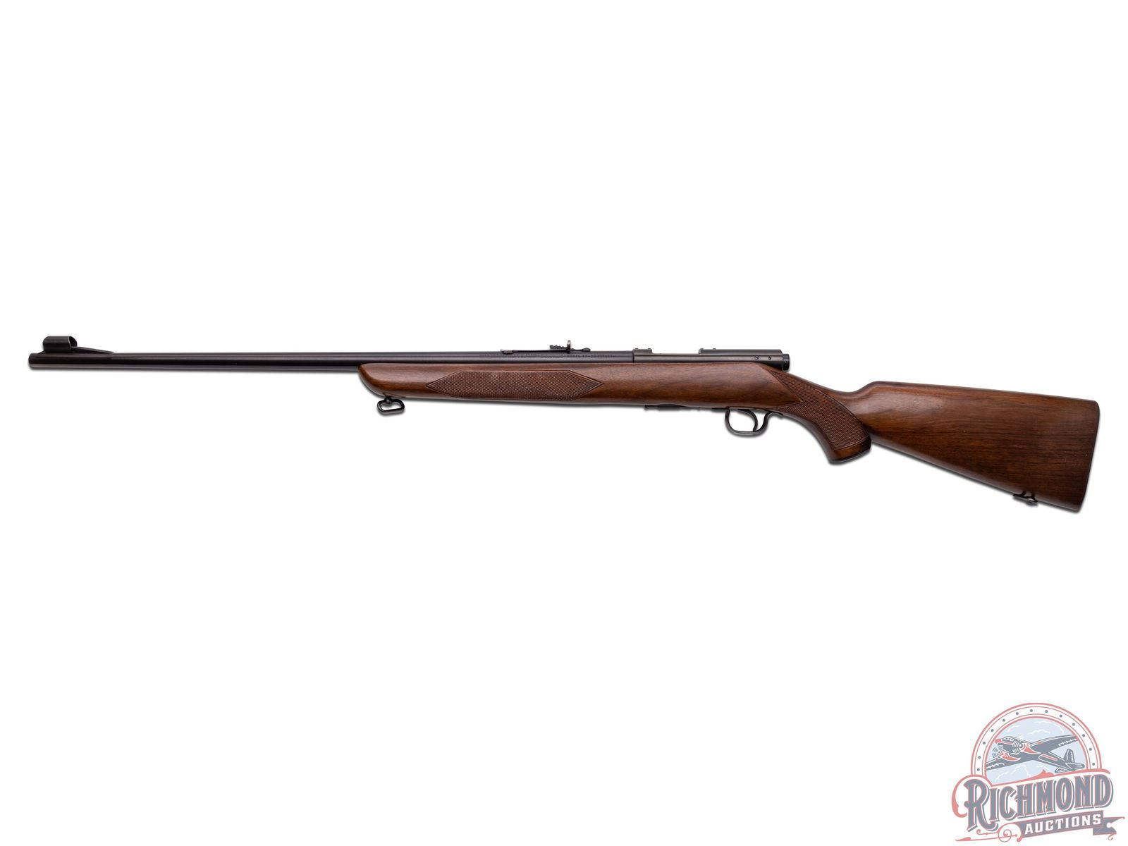 Manufactured circa 1950's and comes with the original factory box. Features a 24" blued round barrel with standard Winchester roll marks and proof marks. Hooded ramp front sight and rear adjustable Buckhorn notch sight. Receiver is factory drilled and tapped for optics. Deluxe walnut wood stock with hand checkered pistol grip and forearm. Fitted with swivel sling rings, Winchester logo metal pistol grip cap and checkered steel butt plate. Includes factory detachable magazine, original factory box and a copy of the original instructions. LOP: 13-3/4". CALIBER: 22 HORNET. S/N: 57677A. FFL STATUS: Curio & Relic.