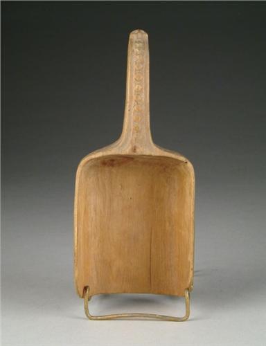NICELY CARVED WOOD SCOOP. Deep rectangular scoop section having finely carved diamond decorated handle with carved hook end. SIZE: 7-1/2in. l x 3-1/4in. w. CONDITION: Very good. 9-25379