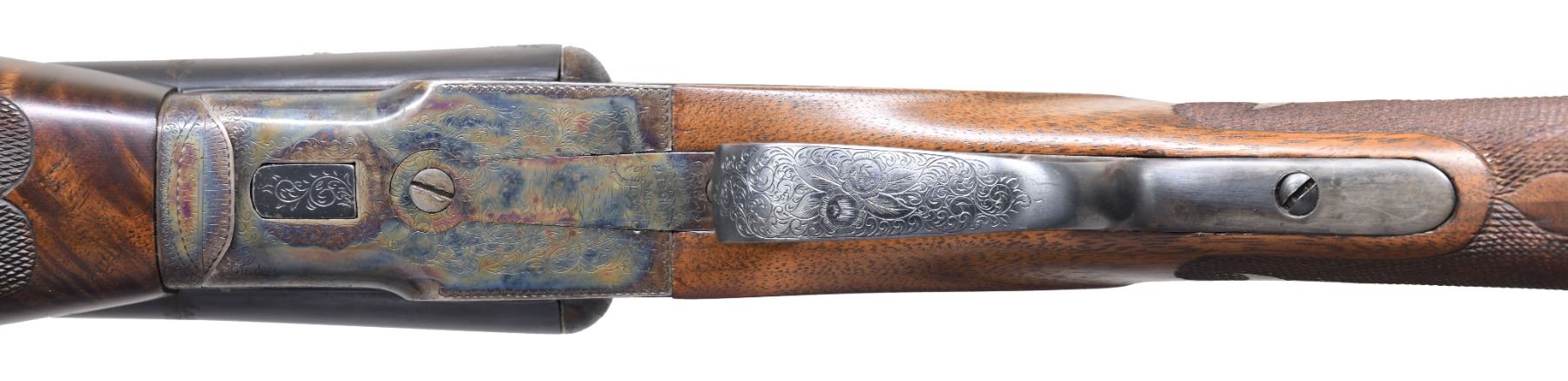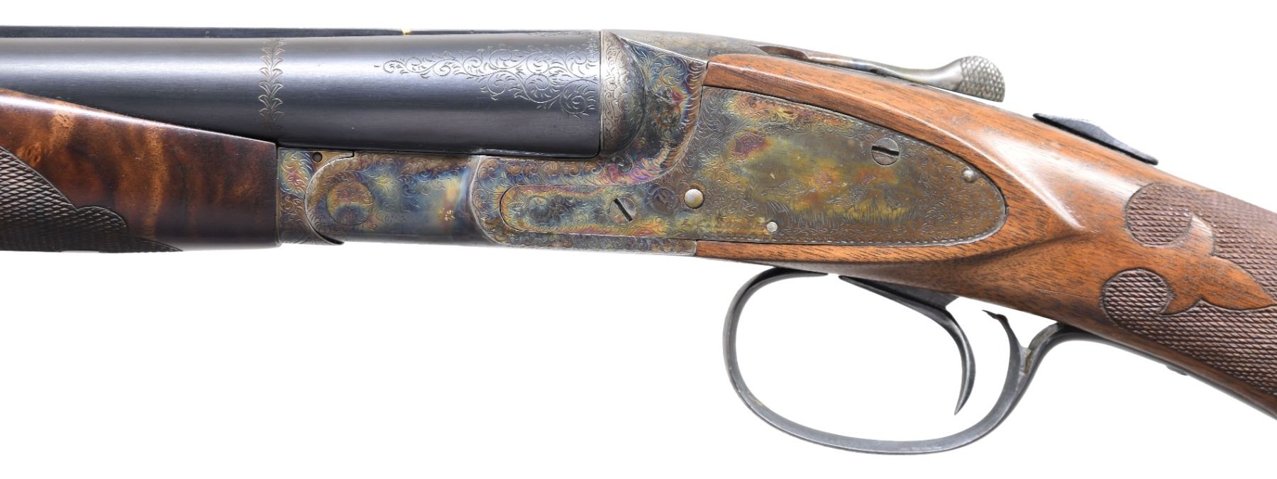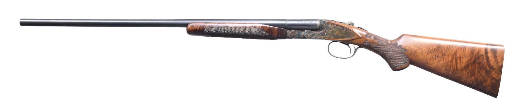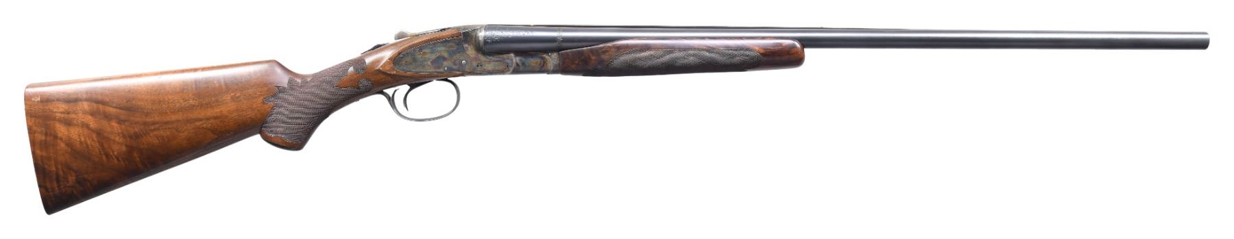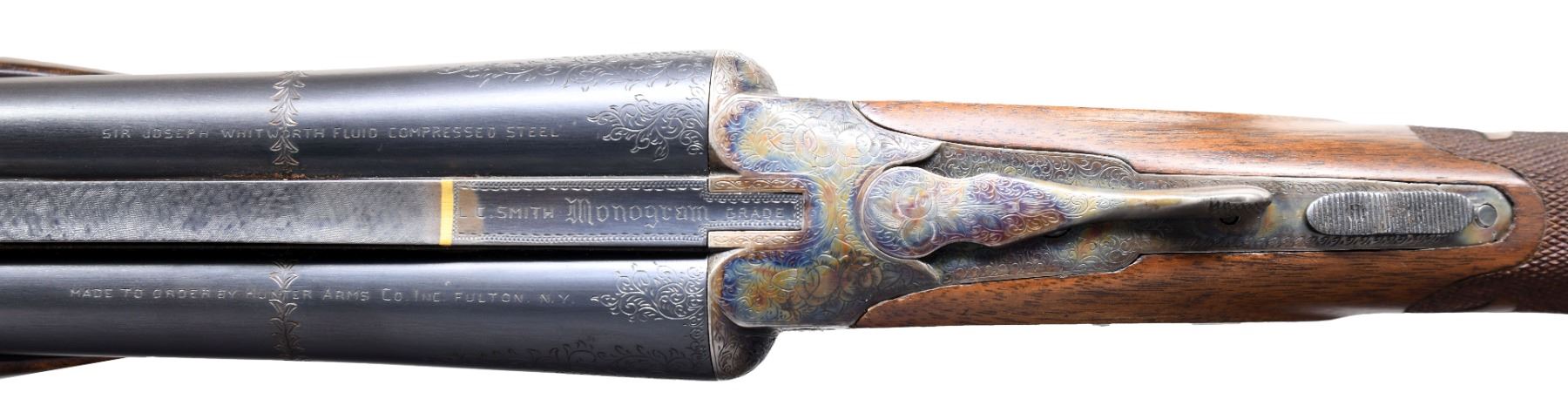 Cal. 20 Ga., 2 3/4". S# FWE176839. Bbls. 26" with concave solid matted rib, choked IC and Full with ejectors. This shotgun started out life as a Specialty grade and has since been placed through a custom upgrade to replicate a Monogram. Top of bbl marked "L.C. Smith Monogram GRADE" behind gold band inlay. Single line of simple floral engraving appears on each bbl. in area at front of chambers. Case colored action features fine scroll engraving with occasional floral accents. 4 Standing pigeons appear on left side, with 2 game bird on right and 4 waterfowl on bottom above applied "HUNTER ONE TRIGGER". Highly figured, oil finished checkered walnut pistol grip stock & beavertail forend. LOP: 14" over checkered wood butt. DAC: 1 1/4". DAH: 2 1/8". CONDITION: wood and metal very good as refinished during upgrade. Bores very good. Right side of stock has wood impression from prior label "20 Ga MONOGRAM". Action in need of service as it does not cock wither bbl. Rear tang appears to have later touch up Cold Blue finish. Barrels are sleeved. (25-1410/BH). CURIO. $800-1,200.