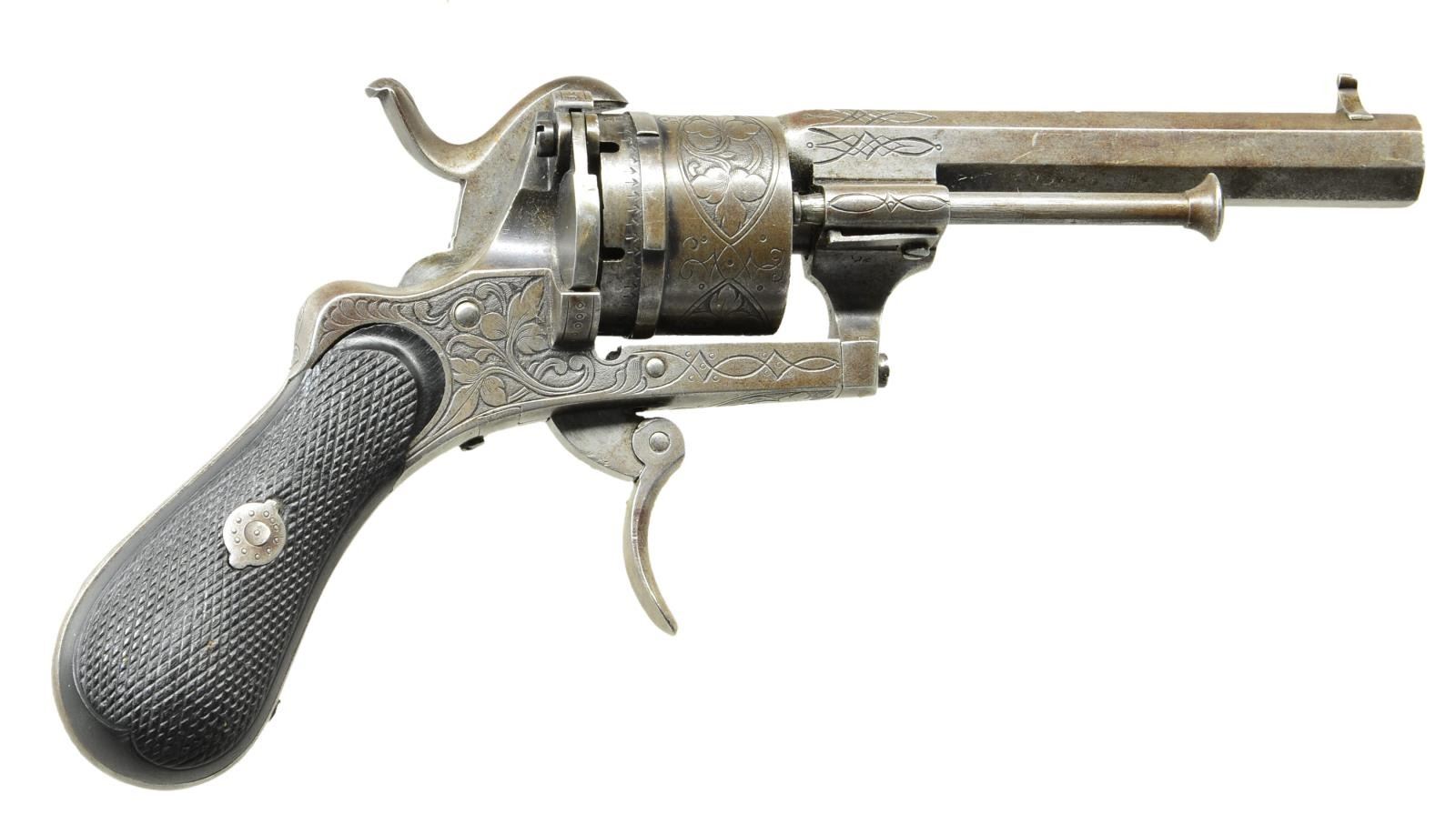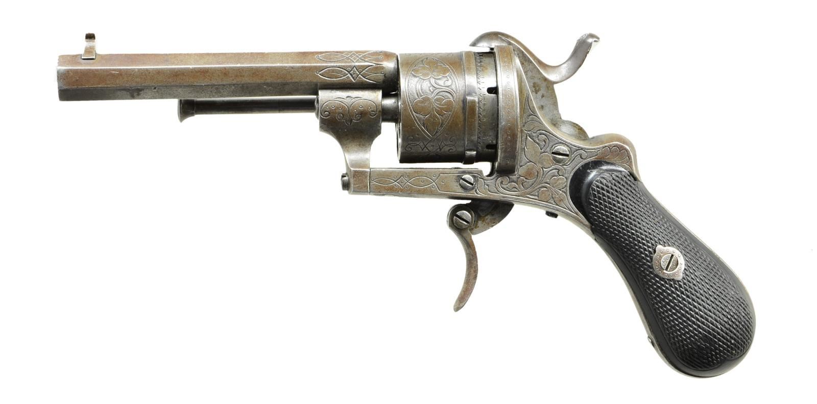 Cal. 7.65mm PF. NSN. This revolver is of good quality & has a 3.5" octagon bbl. Frame features folding trigger, unloading lever & loading gate on right side. Pistol is double action. Frame, cyl. & bbl. are engraved w/ scrolling acanthus & looped line borders. Well shaped grips are checkered ebony. CONDITION: metal parts cleaned to gray. Grips rate fine. Bore is lightly pitted. Trigger needs to be pushed forward to allow functioning. Cyl. will not rotate. (01-21093/MGM). ANTIQUE. $200-300.