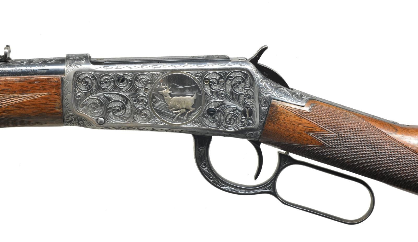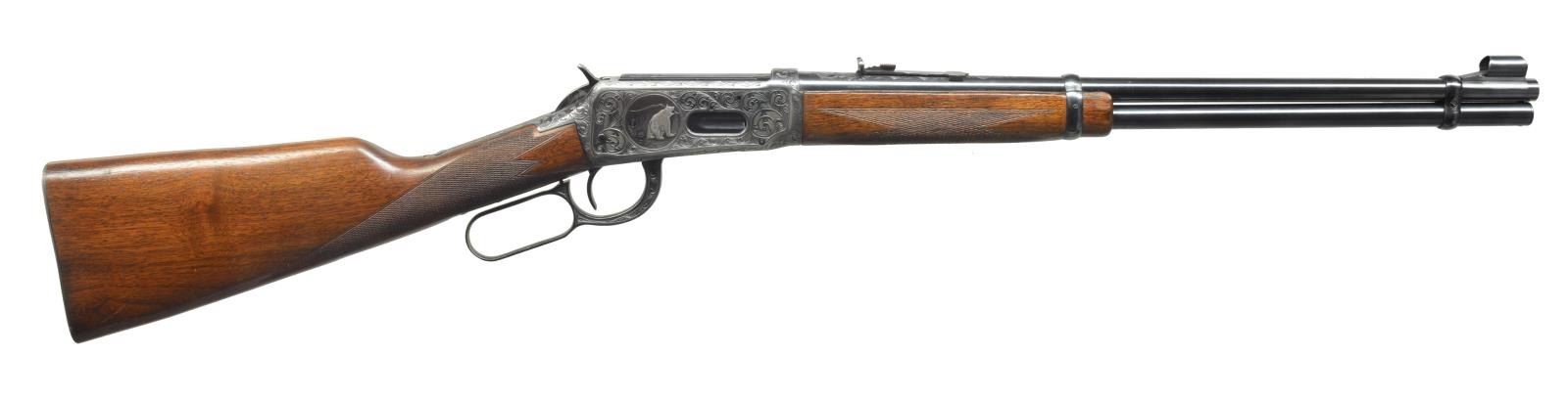 1894 CARBINE. Cal. 30-30. S# 2546529. Bbl. 28" w/ semi buckhorn rear sight & silver bead on front ramp w/ hood. Blued action rear portion of bbl. are engraved near full coverage lg. open shaded scroll surrounding circular vignettes of big game animals. Subject’s all silver inlayed in semi-relief w/ running white tail deer on left side & growling bear on right. Buttstock of plain American walnut has checkered steel buttplate & is nicely checkered in point pattern at grip. Matching checkering is on forend. CONDITION: very fine as custom finished. Bbl. & mag. tube retaining nearly all factory quality reblue. Action w/ most of its blue, has had bluing removed on sides to accent engraving. There is hand wear around bottom. Stocks retain nearly all of a factory type finish w/ scattered marks & dings. Bright shiny bore. Mechanically fine. (20-3539/MGM). MODERN. $1,200-2,500.