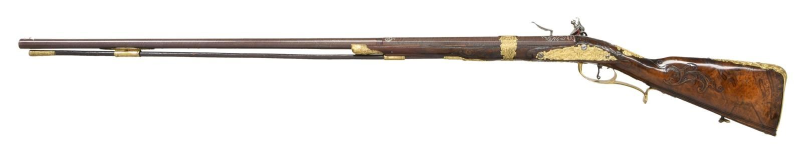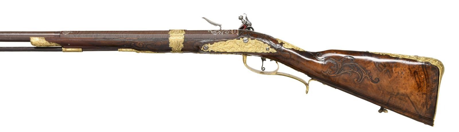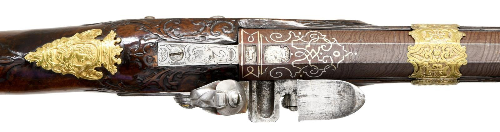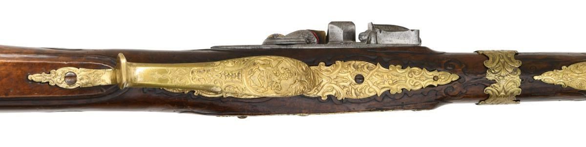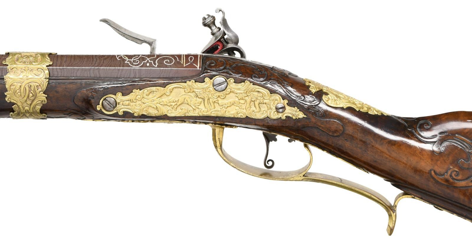 FLINTLOCK FOWLER. Cal. 60. S# NSN. The 39" twist octagon to round barrel is inlaid with flush silver wire in the form of scroll and geometric patterns. A large crowned platinum poincon at breech end is marked "ROCH" "US" "SUHL" "DUT" (?) . A second mark is of a trotting horse (maker not found). Barrel tang with scroll engraving is marked "2". Chamfered lock with serpentine cock has inset faceted pan, unbridled friction frizzen, feather spring has large scrolled finial. Lockplate and face of cock are very finely relief engraved with scenes of horse and rider, pipe playing pan, along with helmets and arms. Half stock of crotch figured European walnut attaches to barrel with slip on gilded brass collar in Viennese manner. Mouldings are around lock, sideplate, barrel channel and other gilded brass fittings. Raised carved scroll is around trigger guard tang and at juncture of grip and butt. A deep moulding runs along toeline. All fittings are of very fancy relief cast brass that has been gold plated. These decorations are in the form of human and animal figures surrounded by acanthus scroll. Hickory ramrod with brass tip mounts through single brass pipe soldered to bottom of barrel with another smaller pipe mounted in stock with matching thimble. CONDITION: fine as attractively restored. Barrel retaining over 90% brown finish with excellent definition to pattern. Lock is cleaned to silver gray. Stock has French polish refinish over many old marks and has some subsequent scratches. Brass furniture has been re-gilded and is quite bright. Bore is fairly shiny but shows some pitting. Lock is good. (01-23959/MGM). ANTIQUE. $4,500-6,500.