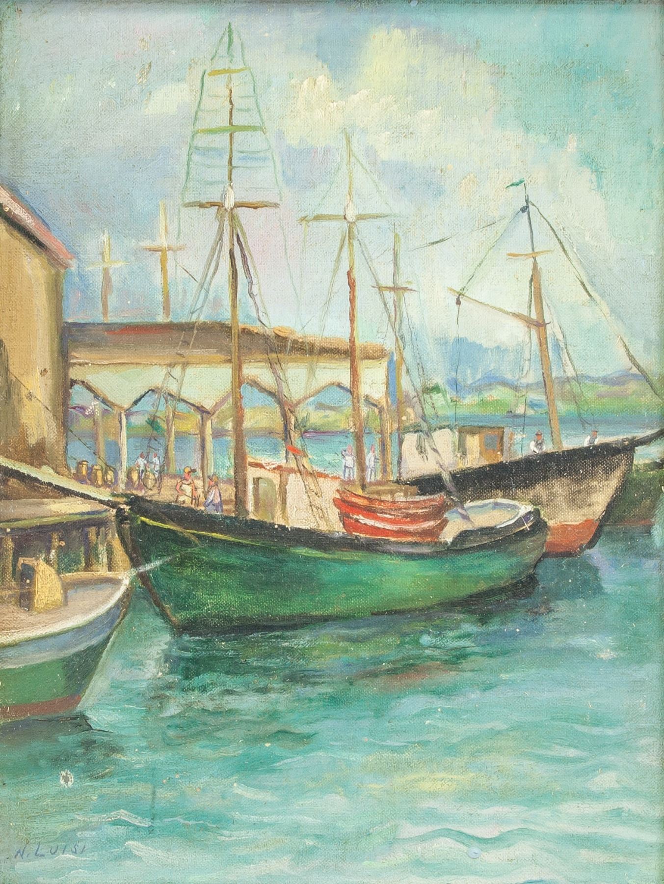 Oil on board. Featuring coastal scene with ships at port. Signed and attr. Nicholas Luigi (American, 1894-1977). 12.6 x 9.4 in. (32 x 24 cm). Nicholas Luisi was an American visual artist who was born in 1894. Several works by the artist have been sold at auction, including 'View Across the Hudson from the Train Yard' sold at Barridoff Galleries 'Fine Art Auction' in 2012. The artist died in 1977. PROVENANCE: Upper New York estate