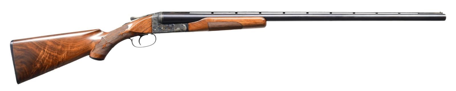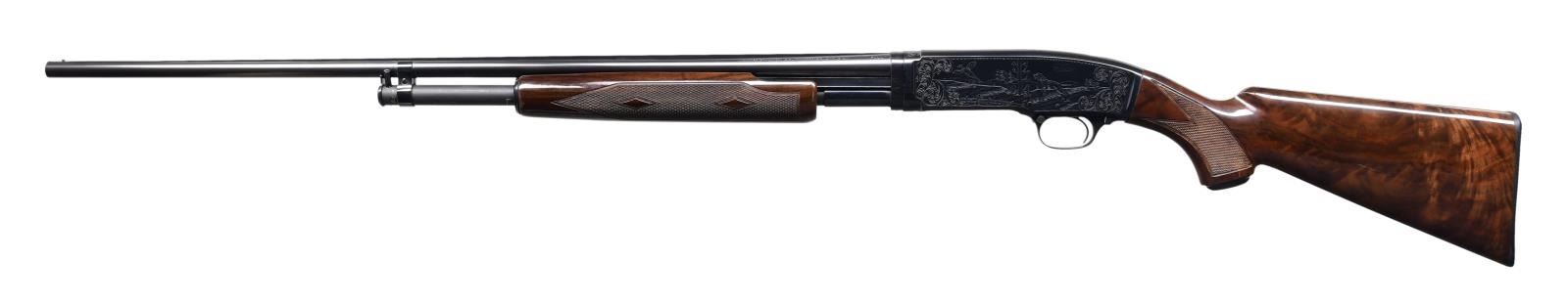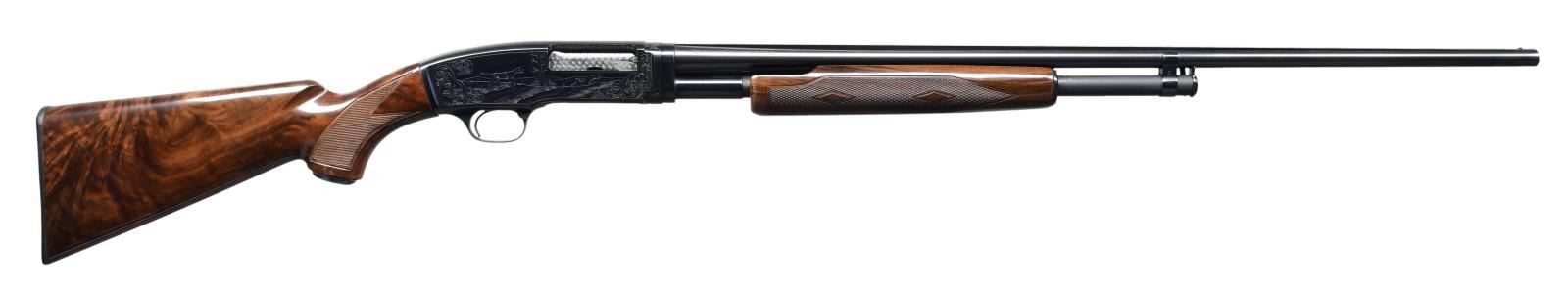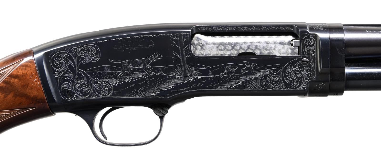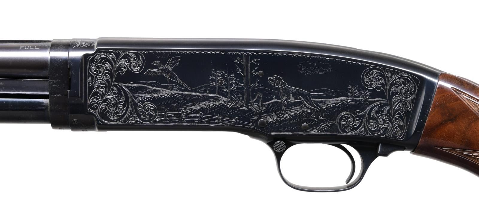 Cal.410. 3". S# 20453. Bbl. 28" solid rib with fixed full choke and steel bead. 12-2 pattern engraving by the late Nick Kusmit. The right side of the receiver he depicts a woodland scene with a pointer and two flushing partridge. Left side scene shows a pointer and flushing pheasant. Scenes are highlighted by vine type foliate scroll. Nick was a Master Engraver at Winchester from 1952-1980. He continued to engrave until his death at 92, in 2010. This is one of his last works and the effects of age are obvious. His initials "NK" are found on a fence post on the left side. Machine jeweled bolt and carrier. Aftermarket Big Head safety. Beavertail forearm and steel capped pistol grip stock of fancy walnut w/ diamond pattern checkering and gloss finish. Winchester stocks are 1990s vintage Japanese production. Mfg. 1936. CONDITION: fine as upgraded. Over 97% blue, showing slide wear on mag tube. Stock finish shows small scatter marks. Very good bright bore. (24-1978/DS). CURIO. $6,000-8,000.