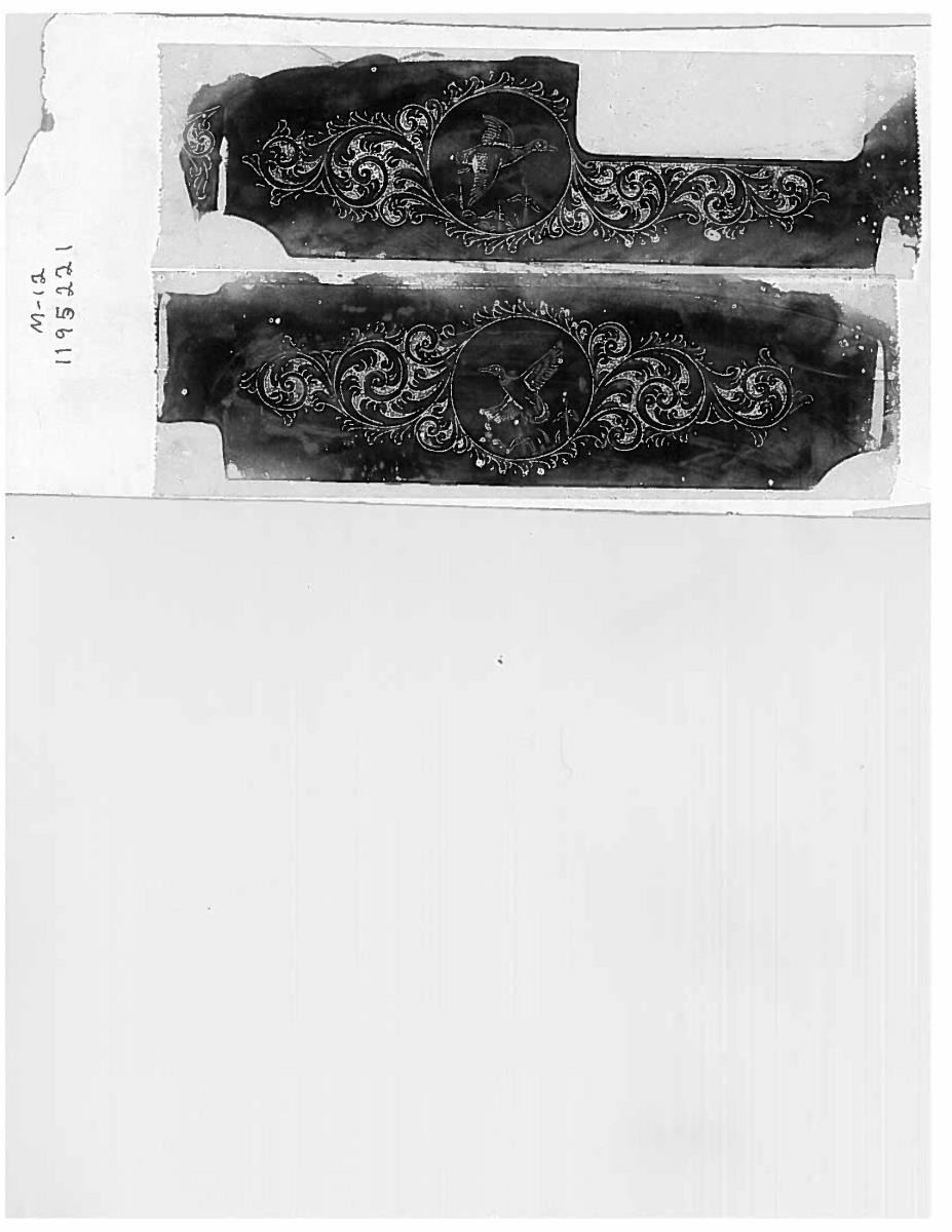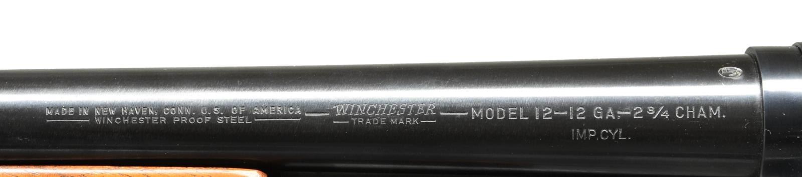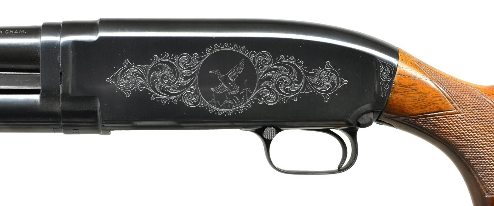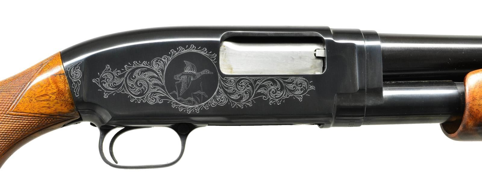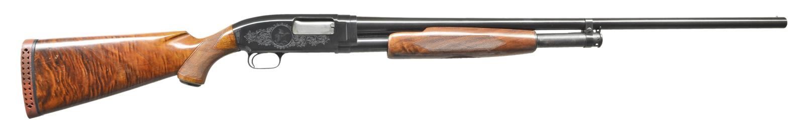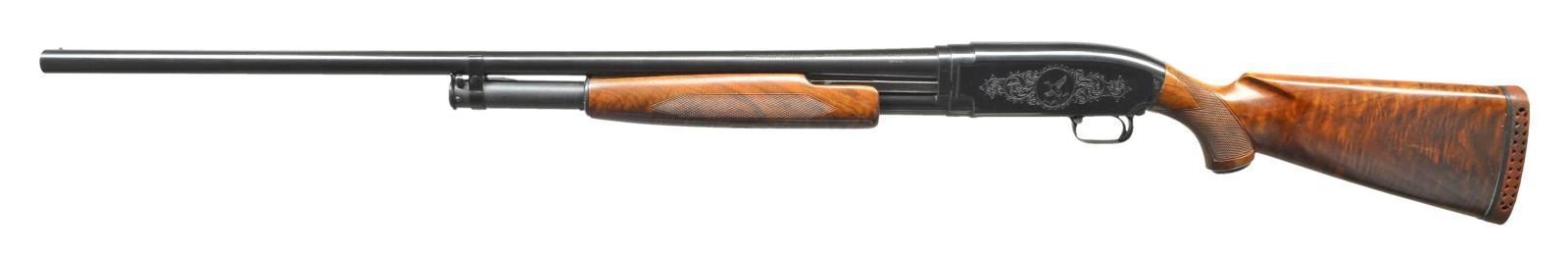 SHOTGUN. Cal. 12 Ga., 2 3/4". S# 1195221. Bbl. 30" plain w/ "IMP-CYL" choke marking & steel bead. Receiver extension is numbered to match action. Custom 12-1A engraving by former factory engraver Nick Kusmit. Vignettes feature flying mallards surrounded by vine type foliate scroll. Left side has Nick Kusmit's initials at lower portion of vignette w/ customers initials "DWL" in the forward scroll area. Custom beavertail forearm of fancy walnut w/ target pattern checkering. Straight comb trap dimension stock w/ steel grip cap. LOP: altered to 14" over an added Winchester red ventilated pad. Mfg. 1949. UNATTACHED ACCESSORIES: smoke prints of right & left side of action given to the customer by Nick Kusmit. CONDITION: bbl. & action retain over 97% reblued finish. Mag. tube shows slide wear. Forearm finish shows areas of wear. Refinished buttstock shows scratches & marks w/ cracks extending from both sides of receiver. Sound action. Very good bore. (21-2035/DS). CURIO. $1,500-2,500.