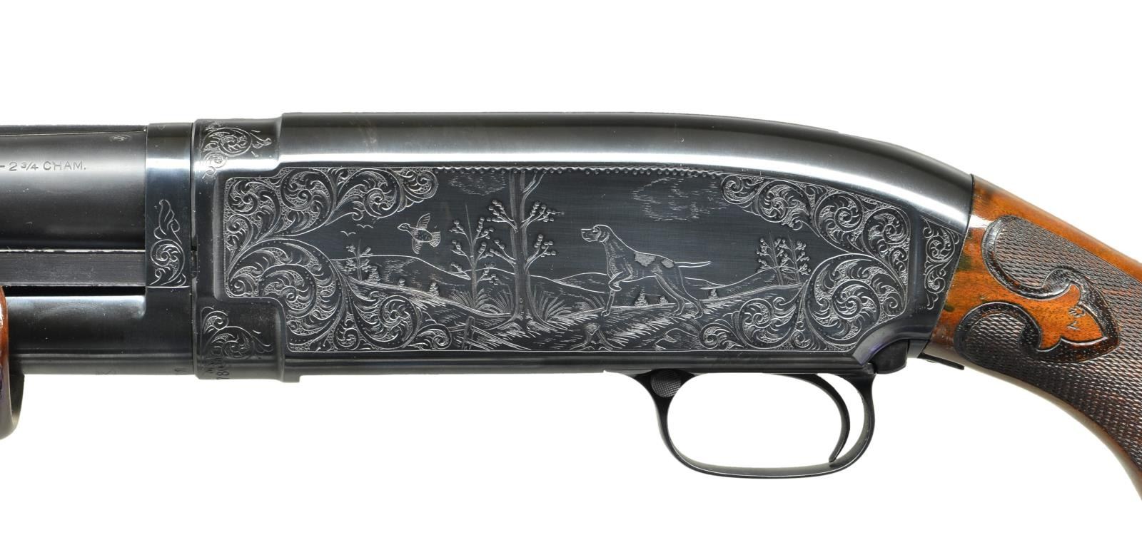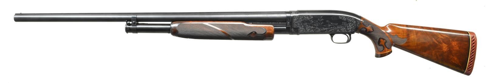 SHOTGUN. Cal. 12 ga., 2 3/4". S# 1106178. Scarce Cyl. choked 28" bbl. of Winchester proof steel w/ solid rib. Steel front bead. Engraved by former Winchester factory engraver Nick Kusmit in his No. 2 Special pattern. Right side features marsh scene w/ 2 flying mallards. Left side woodland scene shows a pointer & flushing partridge. Scenes are bordered by vine type foliate scroll that continues to upper & lower areas of receiver, trigger guard & receiver extension. Receiver extension has an added pigeon. Custom aftermarket beavertail forearm & capped pistol grip stock of fancy walnut w/ fleur de lis segmented hand checkering reminiscent of Winchester style B carving. LOP: 14 1/4" over a red ventilated White Line pad. Mfg. 1948. UNATTACHED ACCESSORIES: Smoke prints of the right & left side engraving done by Nick Kusmit. CONDITION: 97% reblued metal finish. Stock & forearm have custom finish showing spots of wear around the action & scattered handling marks. Trigger will release before action is locked up & must be repaired to be safe. Good bright bore. (21-2238/DS). CURIO. $1,750-2,500.