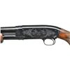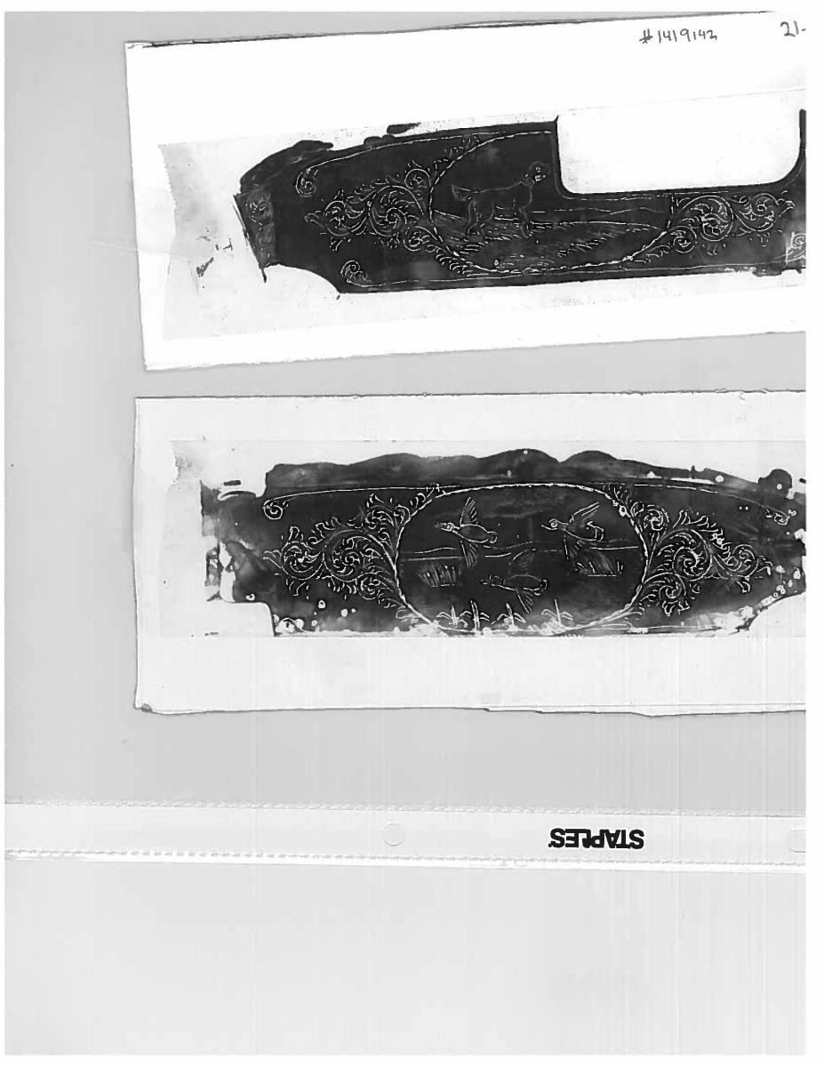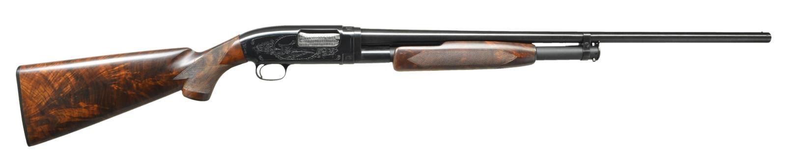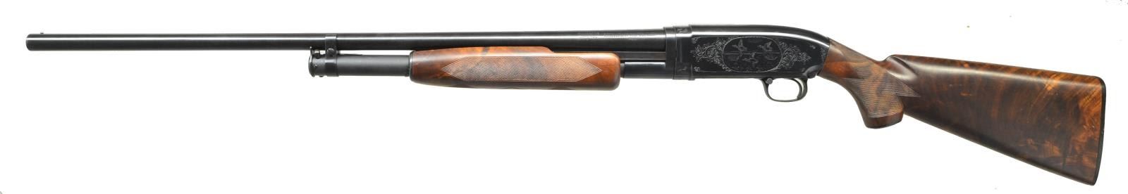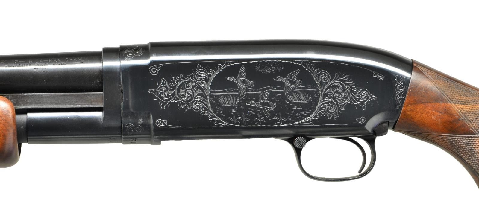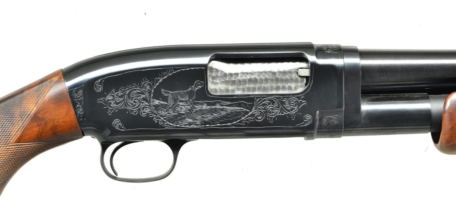 SHOTGUN. Cal. 16 ga., 2 3/4". S# 1419142. Bbl. 28" plain w/ fixed full choke & steel bead. Upgraded to Pigeon Grade w/ No. 3 engraving by famed former Winchester engraver Nick Kusmit. Right side scene features a pointing setter. Left side waterfowl scene features 3 flying mallards. Left scene has Nick Kusmit's signature "NK" & customer initials "DL". Engraved by Nick in his later years, this gun demonstrates the effect of age on his work. Extension has an added pigeon. Jeweled bolt & carrier. Custom aftermarket beavertain forearm & hard rubber capped stock of fancy walnut w/ Pigeon Grade hand checkering. LOP: 14 3/8" over a Winchester buttplate. Mfg. 1954. UNATTACHED ACCESSORIES: Smoke prints of right & lrft side engraving by Nick Kusmit. CONDITION: over 98% reblued metal finish. Wood has good finish & checkering showing sm. handling marks. Good mechanics. Bore shows spots of pitting near muzzle end. (21-2239/DS). CURIO. $1,750-2,500.