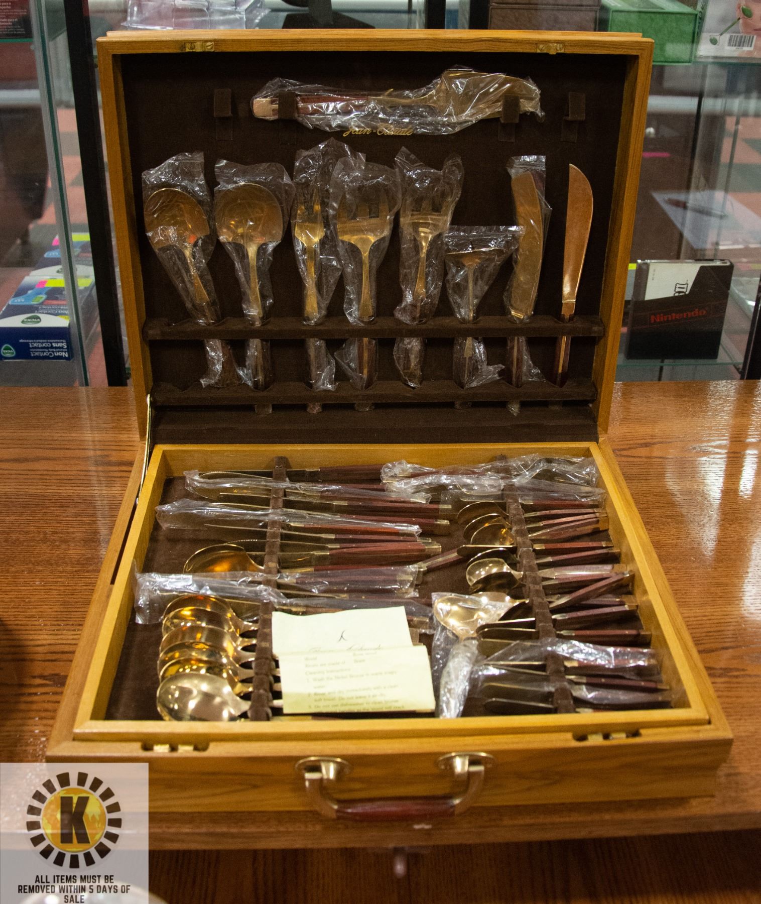 NICKEL BRONZE CUTLERY W/ WOOD HANDLES IN WOOD BOX