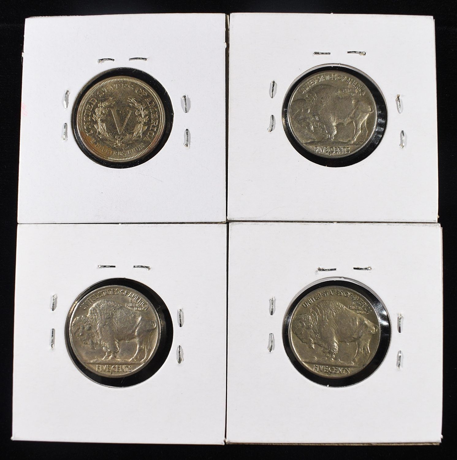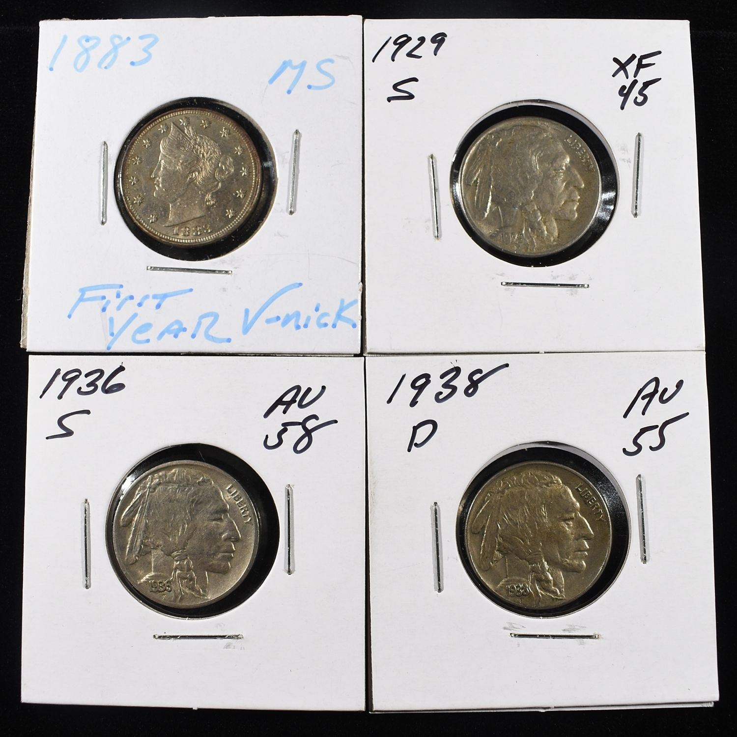 1883 LIBERTY V NICKEL, 1929-S, 1936-S & 1938-D BUFFALO NICKELS ESTIMATE $150 - $200.