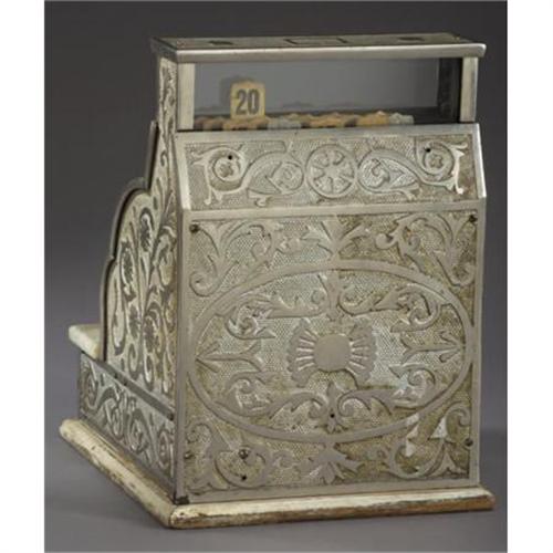 <B>NICKEL COUNTRY STORE CASH REGISTER</B></I> - “Newton” Fancy front; upright keys to $2.00; 12” wide x 17½ tall<BR><BR><B>Condition:</B></I>Finish is fine, top lock and name plate are missing.<BR><BR><b>Shipping:</b> Requires 3rd Party Shipping (<a target="_blank" href="http://www.heritageauctions.com/common/shipping.php">view shipping information</a>)