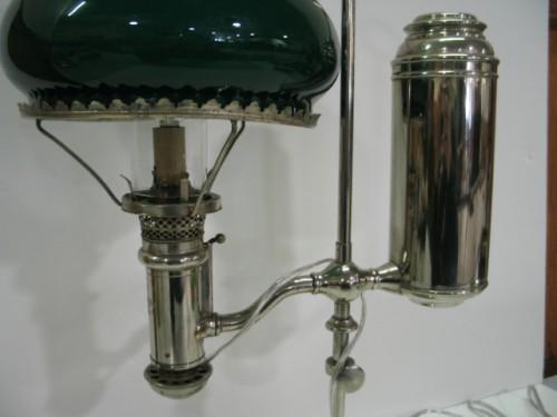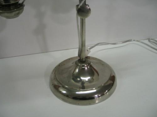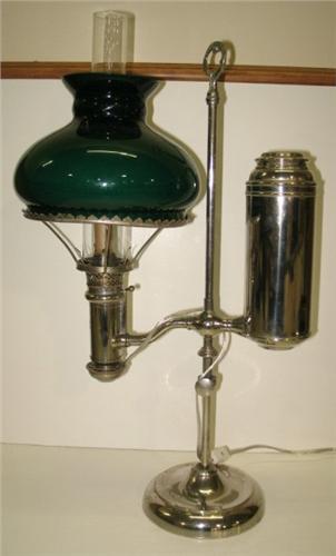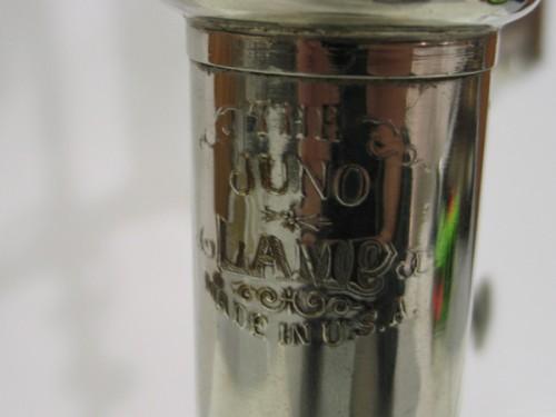 NICKEL STUDENT LAMP. Electrified. Green cased glass shade. Marked “The Juno Lamp-Made in U.S.A.” 22.75” H to top of chimney