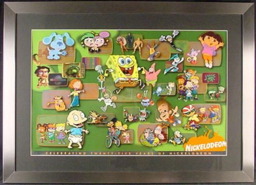 This unique presentation of over 45 characters getting together to celebrate the 25th anniversary of Nickelodeon is really fabulous. Called a "Litho Cel" this limited edition multi-layered presentation is composed of a "splat" background lithographically printed on acid-free metallic paper and a lithographically printed cel layer. Gorgeously framed and ready to hang, this is an irresistible group portrait of Nick's most unforgettable characters! * Image: 22 × 34 * Framed size: 31 × 43 * Medium: Litho Cel with foil enhanced background * Numbered from a limited edition of 500 * Certificate of Authenticity * Mint condition * * Includes images and characters from Aaahh!!! Real Monsters, All Grown Up, Angry Beavers, As Told By Ginger, Blue's Clues, CatDog, Chalkzone, Danny Phantom, Dora the Explorer, Double Dare, Fairly OddParents, Hey Arnold!, Invader Zim, Jimmy Neutron, Boy Genius, Kablaam!, Little Bill, Rocco's Modern Life, Rocket Power, Rugrats, SpongeBob SquarePants, Tak and the Power of Juju, Teenage Robot, Wild Thornberries, and You Can't Do That on Television. * * Fabulous!