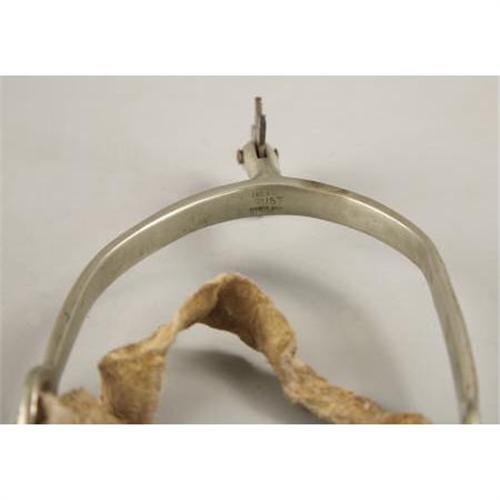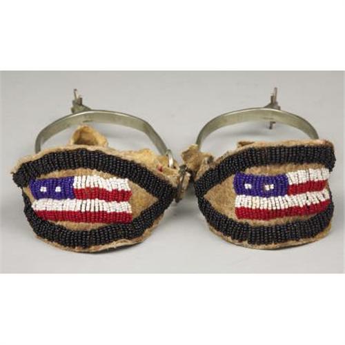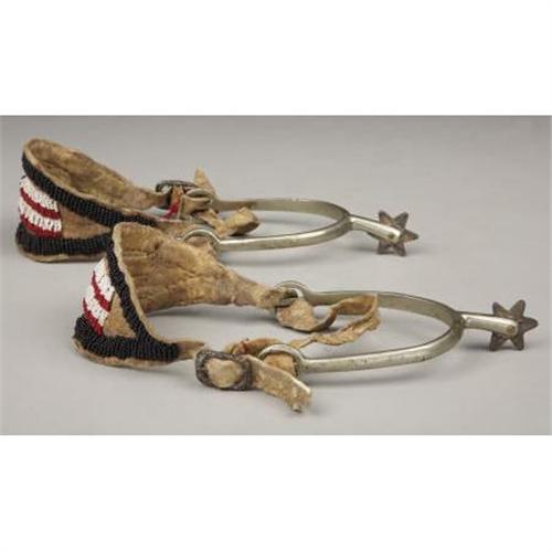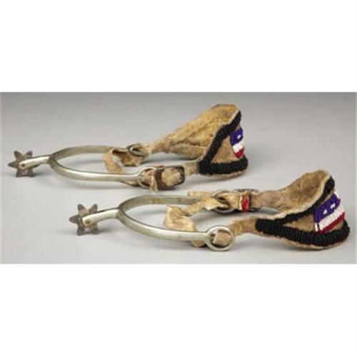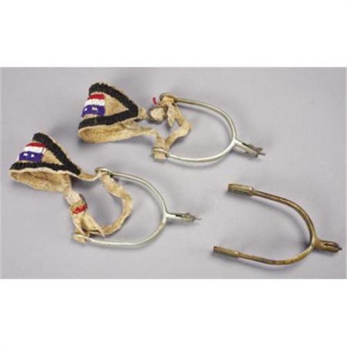 <B>a)NICKLE RIDING SPURS CIRCA 1900</B></I> - English “Never Rust” spurs with added rowels made from coins; Attached contemporary beaded straps; Good condition <BR><B>b)SINGLE MILITARY STYLE BRASS SPUR</B></I> - Double slot spur with raised shank; circa 1890; Heavy tarnish, overall very good condition.<BR><BR><b>Shipping:</b> Miscellaneous Collectibles, Larg (<a target="_blank" href="http://www.heritageauctions.com/common/shipping.php">view shipping information</a>)
