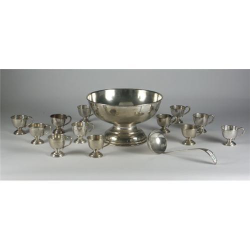 PUNCH BOWL: Nickel silver punch bowl, ladle and twelve handled cups of simple shape with machine-rolled edge; stamped 'nickle silver' at cup and bowl undersides. Note tarnish from storage in plastic wrap. Mid-20th c. 7'' H bowl, 3'' H cups
