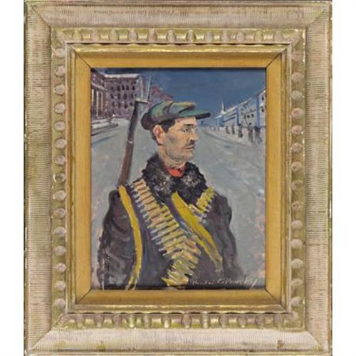 <B>NICOLAI CIKOVSKY (Russian/American, 1894-1987)</B></I><BR><I>Revolutionary Soldier</B></I><BR>Oil on panel<BR>14-7/8 x 11-3/4 inches (37.8 x 29.8 cm)<BR>Signed lower right: <I>Nicolai Cikovsky</B></I><BR> <B>Condition Report:</B> Very good condition<BR><BR><b>Shipping:</b> Requires 3rd Party Shipping (<a target="_blank" href="http://www.heritageauctions.com/common/shipping.php">view shipping information</a>)
