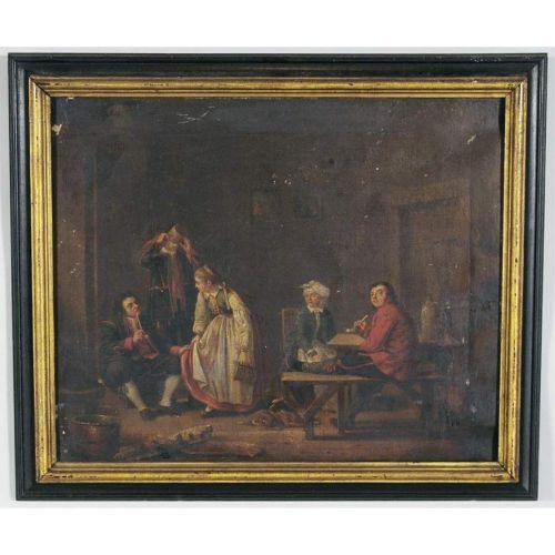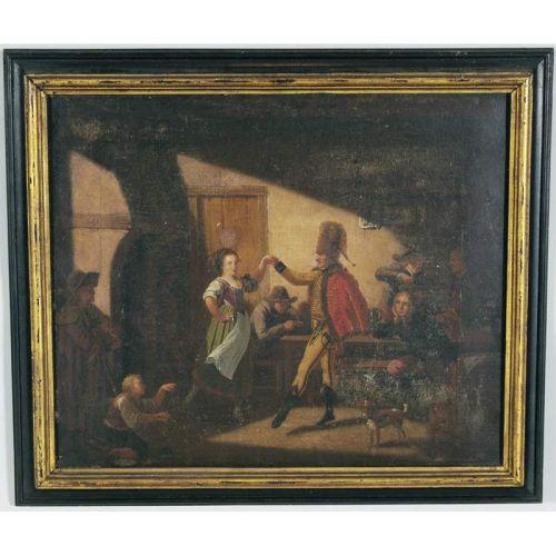 NICOLAS DELERIVE pair of Russian tavern scenes, each 16"x20" o/c signed lr CONDITION REPORT: surface rubs, paint loss, scattered inpainting, frame rubs. PACKING AND SHIPPING: offered by Fairfield Auction to points within Continental U.S.A. and excluding insurance (which will be required and added) $50.
