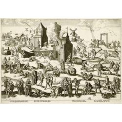 “Siet hier de Weirelt gansch verkeert...”. Darstellungen verschiedener Sprichwörter. Anonyme Radierung um 1540. - Mit vierzeiligem niederl. und franz. Text in der Platte. Größe: 36 x 51 cm. Leicht gebräunt und stockfleckig, mit kleinen Papierquetschfalten, wenigen Knickspuren und leichten Randbeschädigungen. Sammlung “RG” (ligiert; nicht bei Lugt).