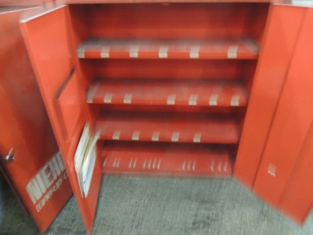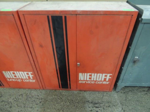 NICE, NIEHOFF TUNE UP PARTS CABINET, COMPLETE WITH TWO DOORS, SHELVES, LOCKING HANDLE, KEY INCLUDED. MEASURES 30" X 11" X 34" TALL. DESIGNED FOR WALL MOUNTING. AS SHOWN.