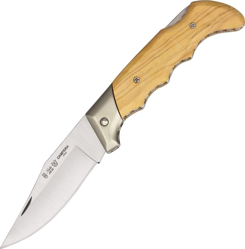 4 3/4" closed lockback. 3 7/8" Acero AN-58 steel clip blade. Fingergrooved natural olive wood handles with satin finish chrome bolster. Fileworked backspring
