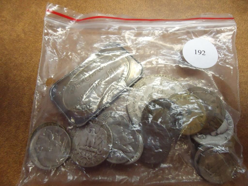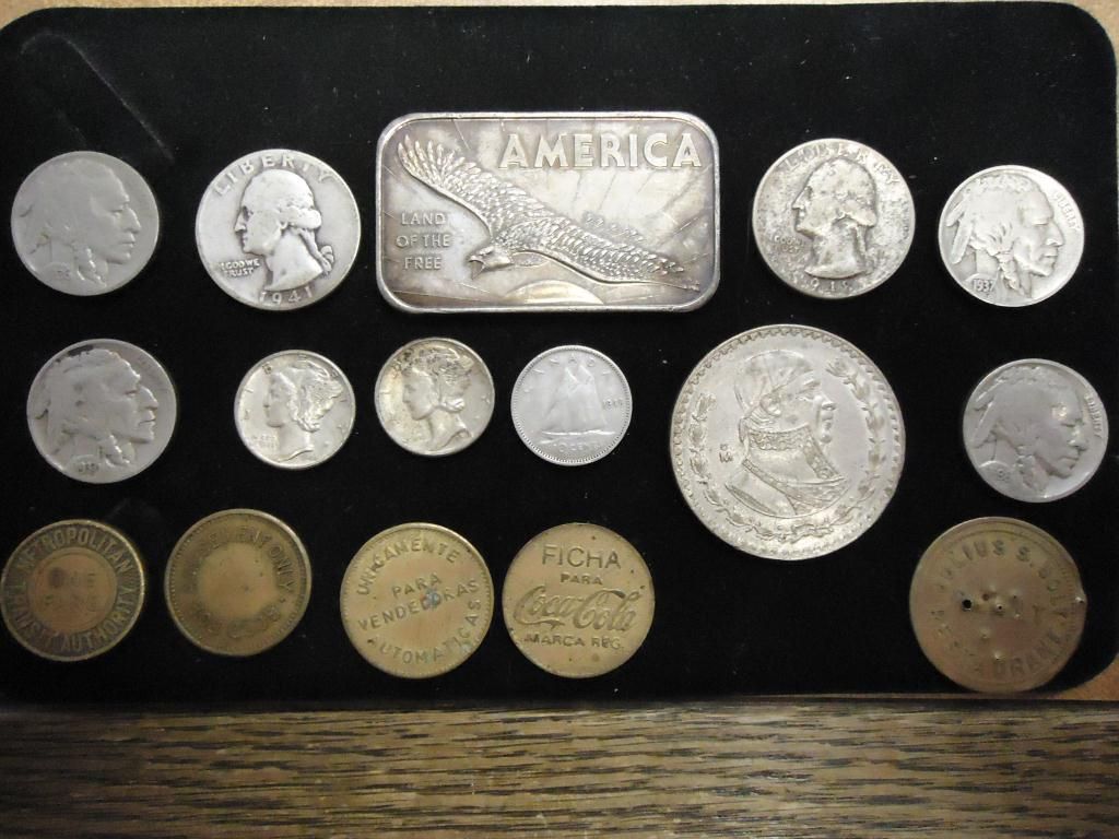 1 OUNCE SILVER INGOT, 2 WASHINGTON SILVER QUARTERS, 2 MERCURY DIMES, 1 CANADIAN DIME, 1 MEXICAN PESO, 4 BUFFALO NICKELS AND 5 TOKENS WHICH ARE NOT SILVER