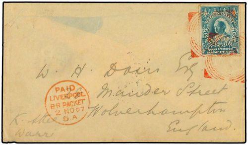 1897 (Oc. 4) Front WARRI (sender¦s endorsement at lower left) to WOLVERHAMPTON, franked by 1894 2 1/2 d. pale blue, perf 13 1/2-14, tied by two strikes of squared circle in red, with ¦PAID LIVERPOOL BR. PACKET¦ transit cds in red at lower left. On reverse, futher strike of despatch squared circle and arrival cds (NO 3 97). The centre of the Warri cancels only legible as albino impressions (as often!), most attractive.
