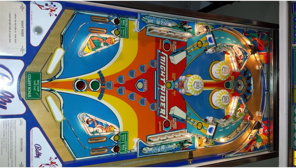 Completely restored original beautiful Night Rider. The playfield has been completely stripped down and all mechanisms rebuilt. Brand new fipper mechs, pop bumper bodies and caps, brand new playfield posts and repainted wood rails. Playfield has been cleaned thoroughly and polished to a high shine. Lower unit in the cabinet has been pulled out of the machine and every switch and coil adjusted and cabinet / lower unit cleaned up. All switches and contacts in the scoring mechs have been adjusted for perfect operation. Cabinet is very sound. Backglass is very nice. Slight lifting in the white area around the score reels that has been sealed for long life.