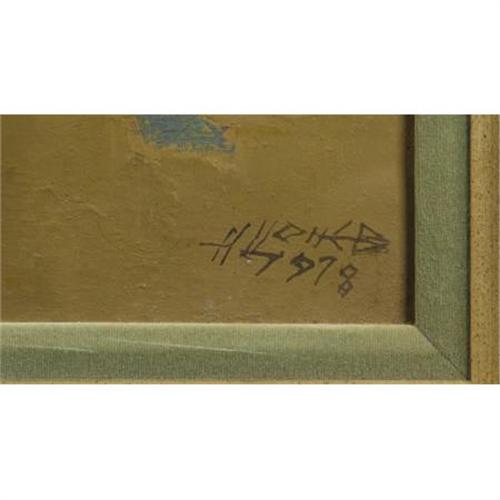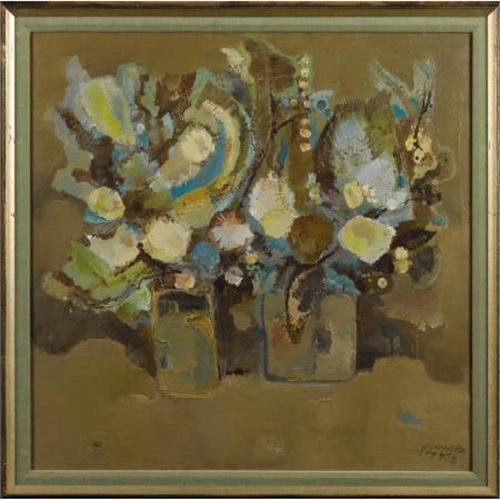 <B>Nikifor Tzonev </B></I>(Russian)<B><BR></B></I><I>Flowers II (Arrangements in Shades of Gray, Blue and Yellow)</B></I>, 1978<BR>Oil on burlap<BR>29-3/8 x 29-3/8 inches (74.6 x 74.6 cm)<BR>Signed lower right and dated<BR> <BR><BR><b>Shipping:</b> Requires 3rd Party Shipping (<a target="_blank" href="http://www.heritageauctions.com/common/shipping.php">view shipping information</a>)