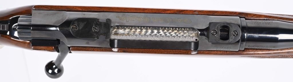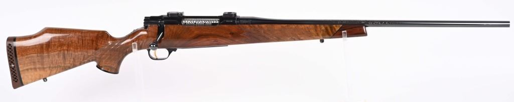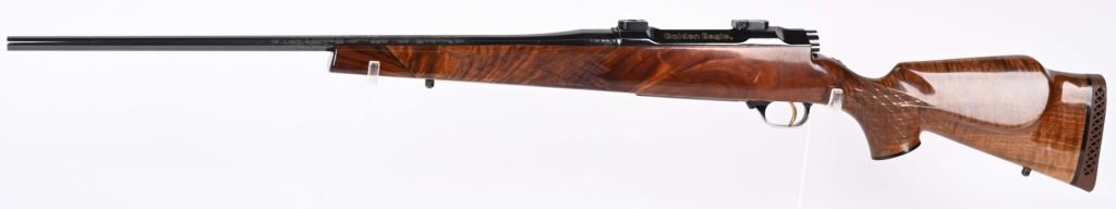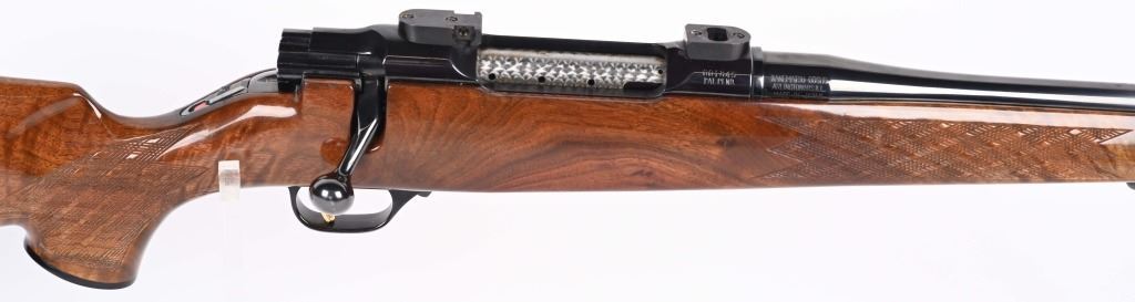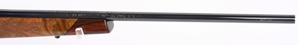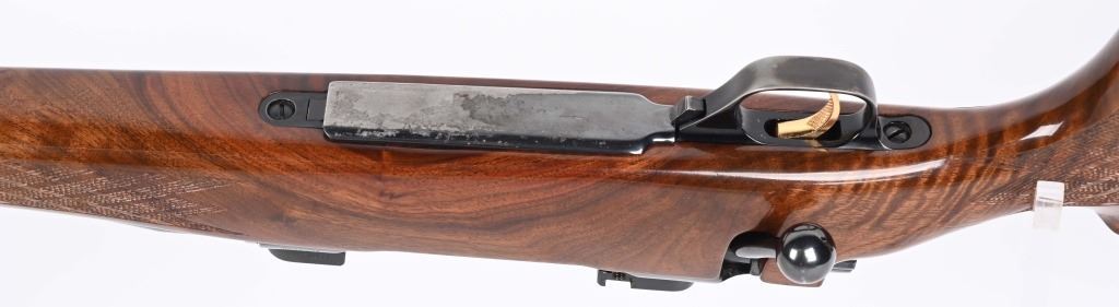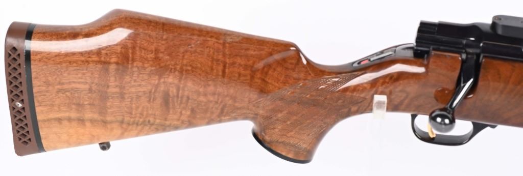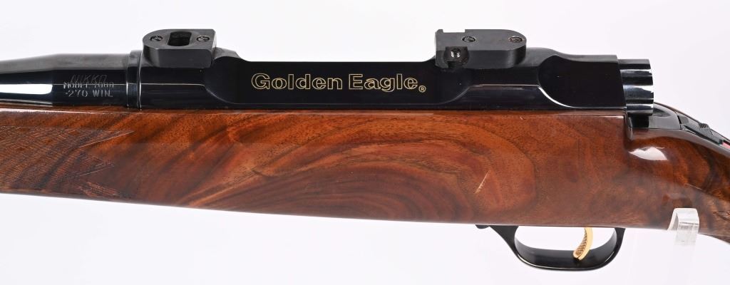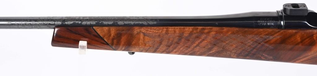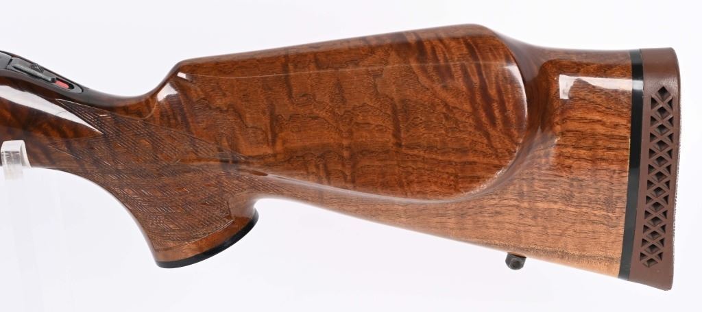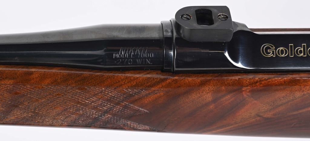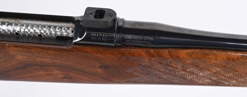 SERIAL NUMBER: 001845. BARREL: 24". CALIBER: .270 WIN. MANUFACTURED: 1980'S Made in Japan. Standard weight barrel with no factory sights. Gold washed trigger and tang safety. Burris scope blocks on the receiver. Factory blued finish and gloss finished wood stock with basket weave checkering on the wrist and forearm. Capped plastic pistol grip and factory brown rubber butt pad. CONDITION: Metal is good overall, with wear on the barrel. Wood has light handling marks and scratches. Bore is shiny with crisp rifling. Mechanically fine. MODERN