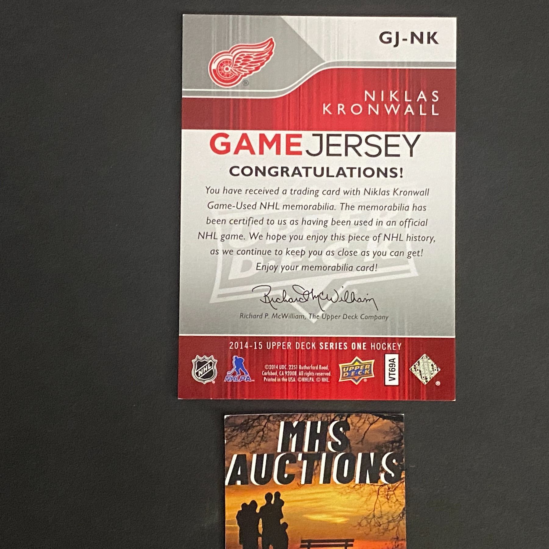 NIKLAS KRONWALL 2014-15 UPPER DECK SERIES 1 RED WINGS JERSEY CARD