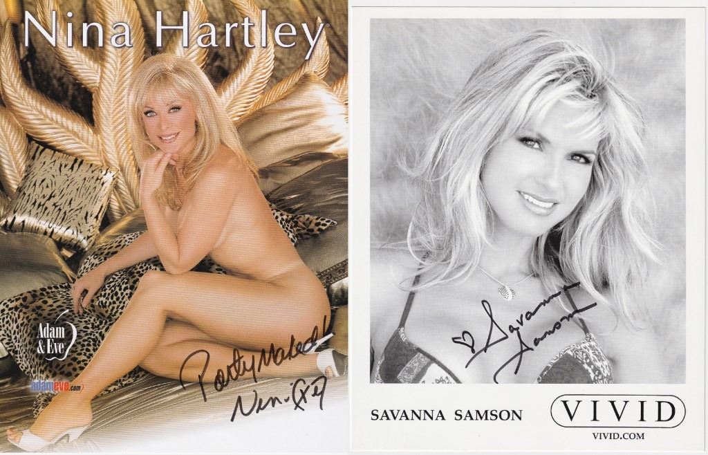 Two signed photographs of American entertainers Nina Hartley (b. 1959), American pornographic and sex educator. Color photo of Hartley signed 'Party Naked!' 8.25x11 inches. With a second signed b/w photograph of American porn actress Savanna Samson (b. 1967), 8x10 inches. Two pieces.