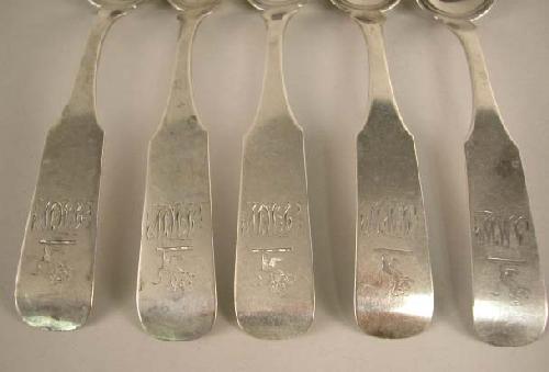 NINE AMERICAN SILVER PLACE SPOONS WITH MAKER'S MARK MONTIETH (ROBERT MONTIETH, BALTIMORE, 1825); Fiddleback with crest and monogram, 7-1/8"l, apx. 9 T.O.