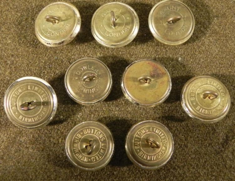 NINE BRITISH REGIMENTAL BUTTONS-SILVER W/BRASS LOOPS & UNDERSIDES * COAT BUTTON SIZE-BY GAUNT/LONDON--BUTTONS LTD/BIRMINGHAM *