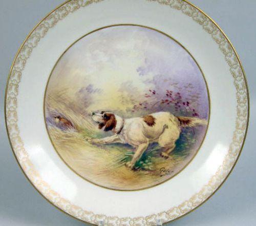Depicting hunting dogs, signed Golse, stamped underside "Limoges, France, Wm. Guerin & Co.". 9 1/2"dia. Wear to gilt rim.