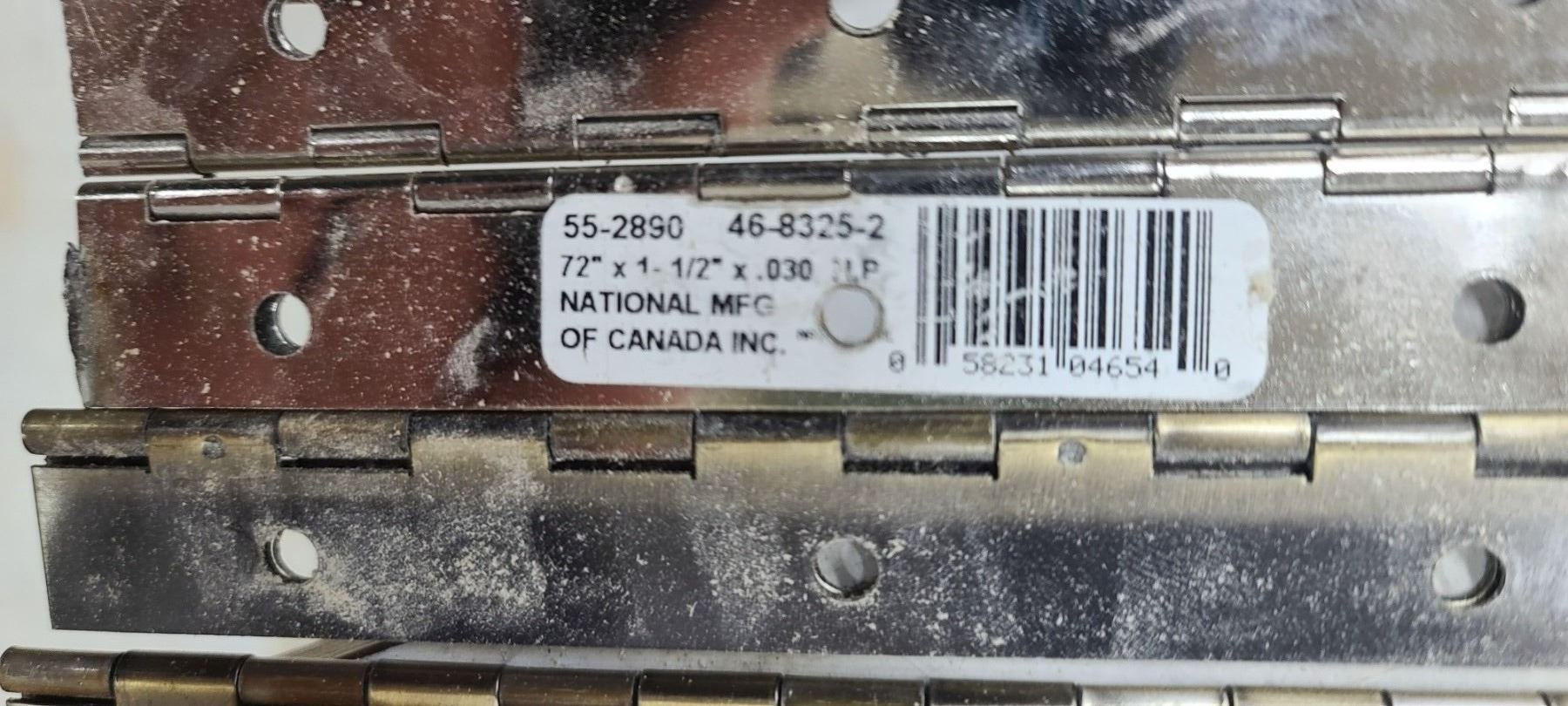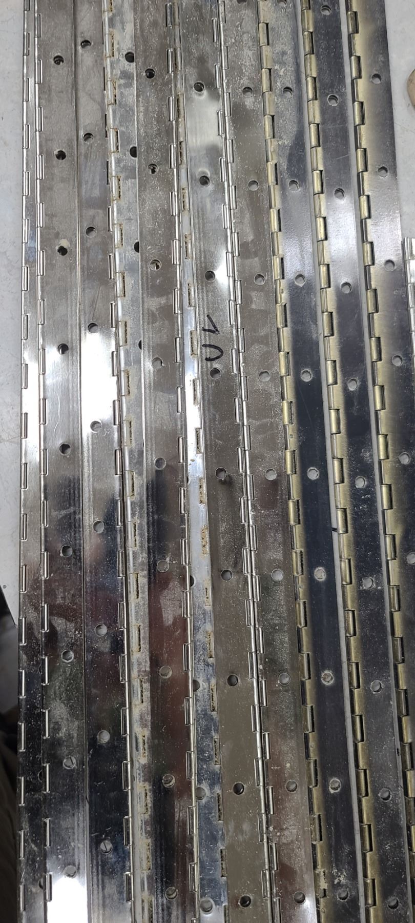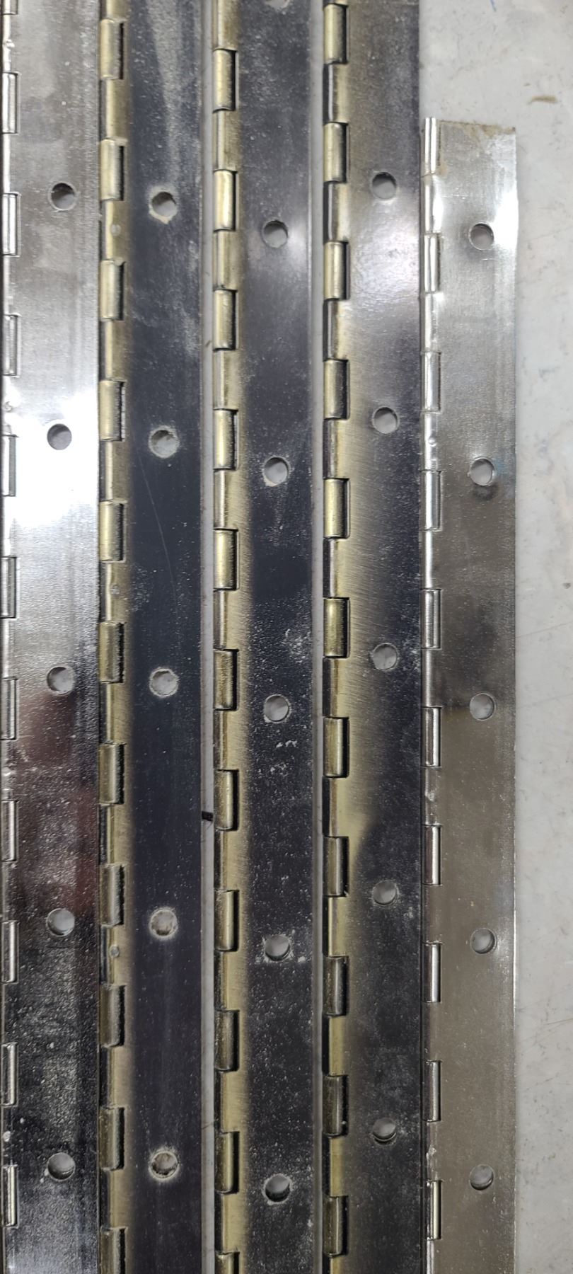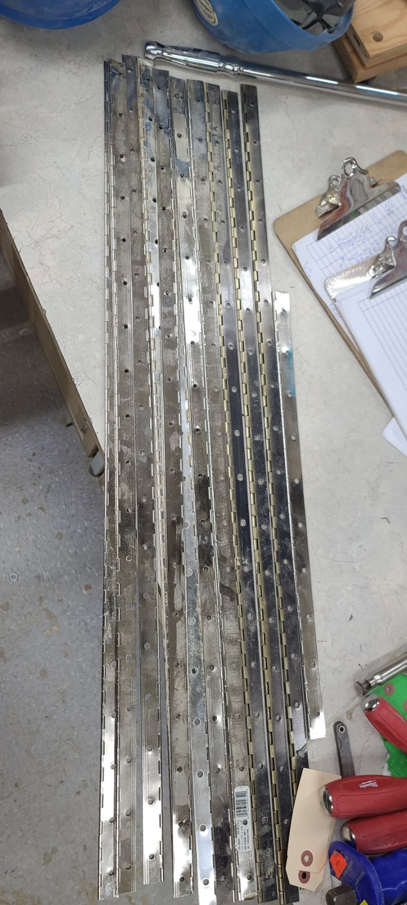 NINE NICKEL 36" X 1 1/2" CONTINUOUS BRACKET HINGES AND THREE DARK BRASS COLOURED HINGES