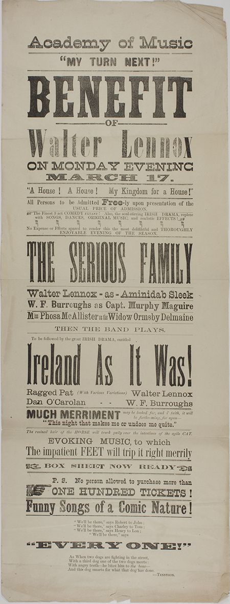 A great pair of printed 19th century theatre broadsides, one measuring 24"x 9", issued by the Academy of Music, which comically announces the "BENEFIT of WALTER LENNOX on…March 17. A House! A House! My Kingdom for a House! All Persons to be Admitted FREE-ly upon presentation of the Usual Price of Admission…". Also: "The resined hair of the Horse will track gaily over the intestines of the agile cat…impatient Feet will trip it right merrily…Box sheet now ready…no person allowed to purchase more than one hundred tickets!…". The other bill, 22 1/2" 8 1/2", issued by the same academy announces the appearance of "Miss LYNDIA THOMPSON and Her New Company" at Wallack's Theatre, New York. Performances to be included will be "LURLINE, BLUE BEARD introducing the HEATHEN CHINEE and SINBAD!". Printed by the Metropolitan Job Printing, Herald Building, NYC. Large chips in lower right margin, else both very good.