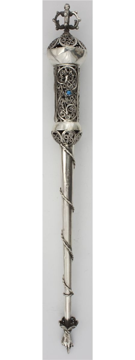 A fine Torah pointed measuring over 11" long, topped with a crown and filigree motif, a small turquoise cabochon below and scrolled rope decoration. Heavy and beautifully crafted, stamped with a series of hallmarks including "1894" and "84". Very good condition save for a bit of bending at the tip, a handsome example.