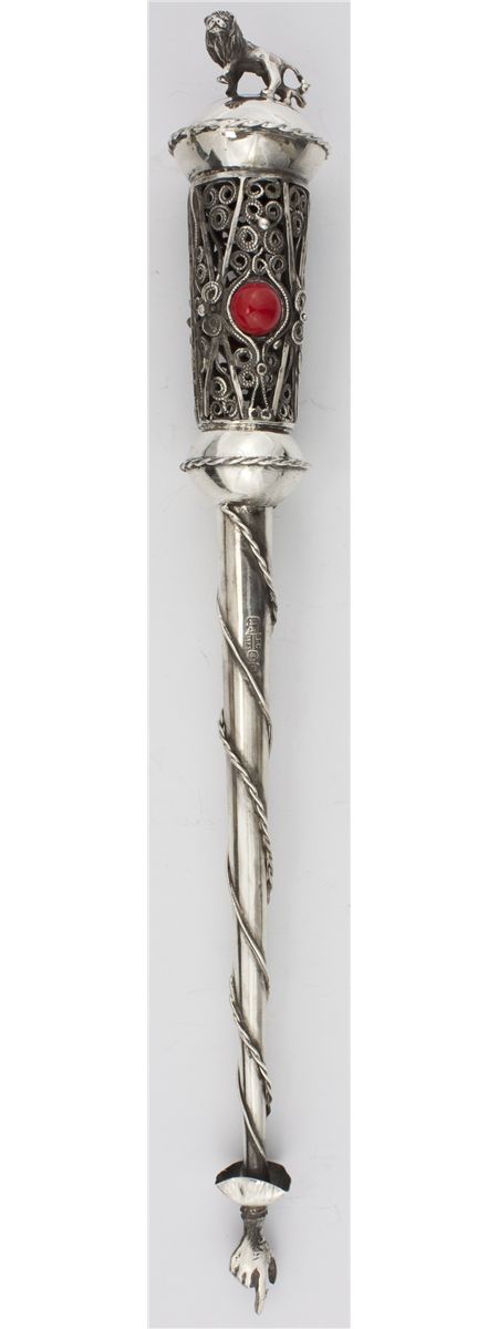 A fine Torah pointer from the late nineteenth-century Torah pointer, measuring 10 1/2" long, bears a lion at top beneath which are filigree decorations with two red cabochons thereon. Hallmarked with several stamps including "1875" and "84". A dent here and there, barely noticeable and do not detract, otherwise a fine example.
