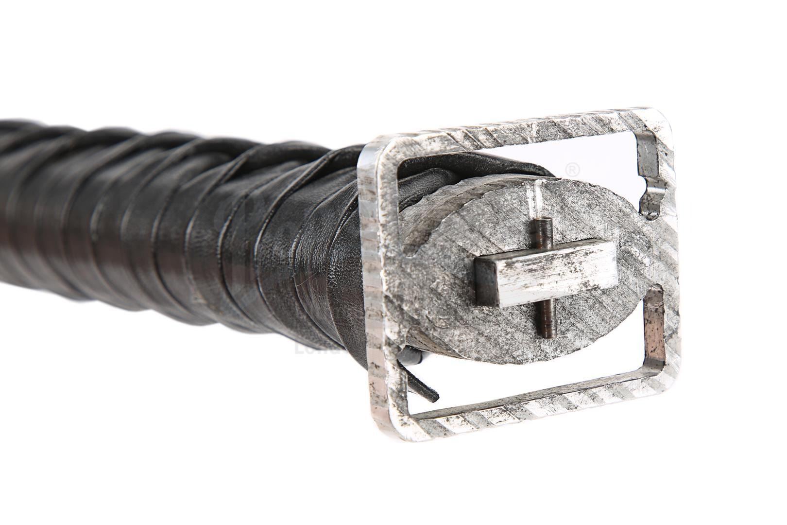 The sword comprises an aluminium blade, a wooden grip wrapped in black leather, and a thin metal square-shaped tsuba. A blood groove runs along the majority of the blade length and the bottom of the sword features a mount where the other half of the weapon would have attached. The blade exhibits minor wear and light scratches, and the leather has begun to unravel slightly at the bottom of the grip. Dimensions: 100 cm x 5 cm x 4 cm (39 1/2" x 2" x 1 1/2")