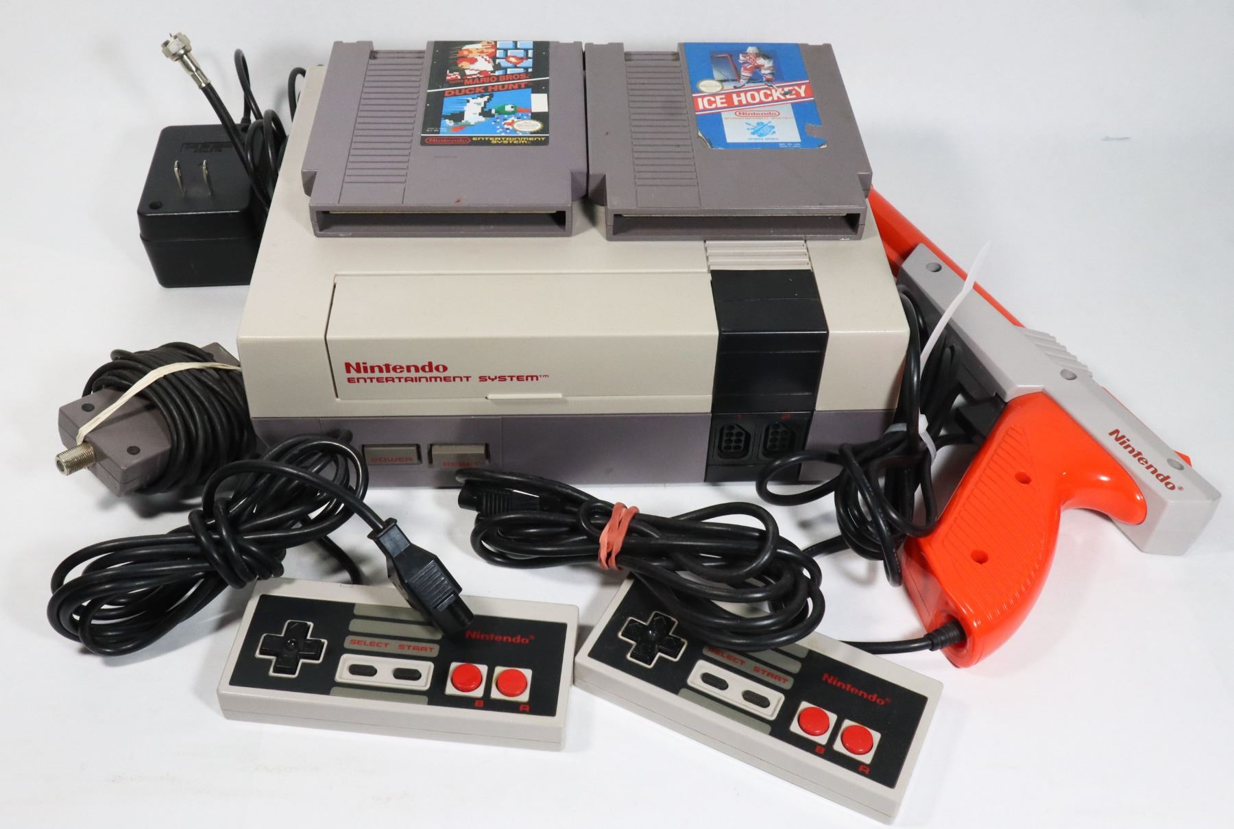 NINTENDO CONSOLE WITH 2 CONTROLLERS, ZAPPER GUN,